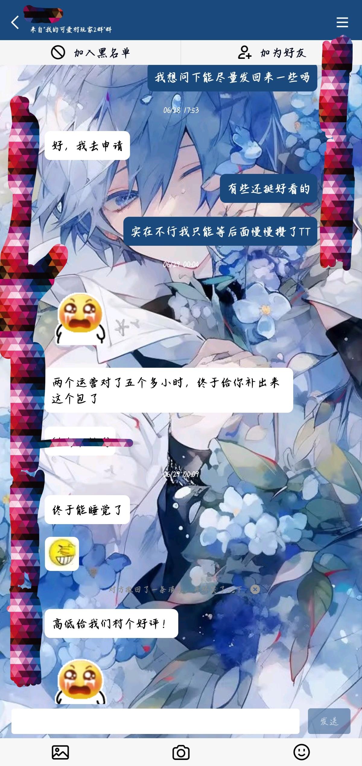开服时有个bug,收了房子会把那个房子里的所有家具吞了。我刚好触发了这个bug,我在QQ群里问,一个运营小姐姐就和我私聊。后面补了家具,给了个蚊子腿补偿兑换码,也发了一套补偿的村立牌周边。凌晨我躺着床上试图睡觉,没开免打扰,静静听着QQ叮叮叮的声音,她凌晨和我说:“两个运营对了五个小时,终于给你补出来这个包了。”