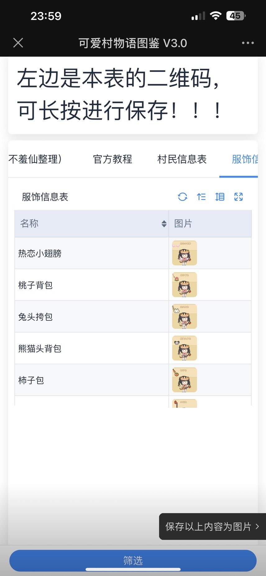 可爱村物语图鉴 V3.0 由Elliot搭建 特别感谢:Elliot的猪猪、不羞仙、闵suga的chimchim、阿淼宝宝提供的数据和支持 当前数据更新日期:2023年2月19日 更新历史: V1.0 2023年2月15日更新:新建 V2.0 2023年2月18日更新:增加新手教程和图鉴 V3.0 2023年2月19日更新:更名为图鉴,增加村民信息表和服饰信息表 链接在评论区