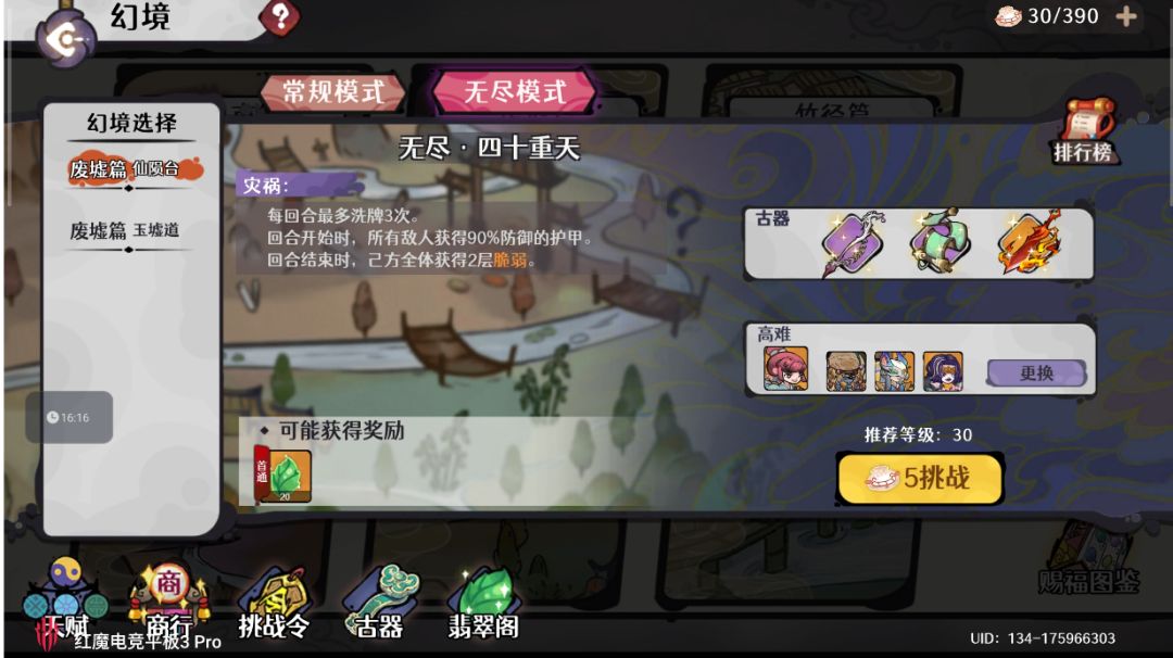 hello 大家好,我是夜月神 [表情_开心] 完美的古器搭配对于通关幻境无尽99层达到【武道巅峰】是极其重要的! 随着紫镰up池结束,我将给大家带来 手动(自动)紫镰体系在各个无尽幻境中古器的搭配选择,希望对你们打无尽幻境能起到一点点帮助。 叠甲:游戏理解不分对错,我只做推荐,你带你喜欢的即可 [表情_比心] 【玉墟道】 无尽幻境古器推荐:赤灵钵 +虎符骨+玄阴铃 总结: 赤灵钵 +虎符