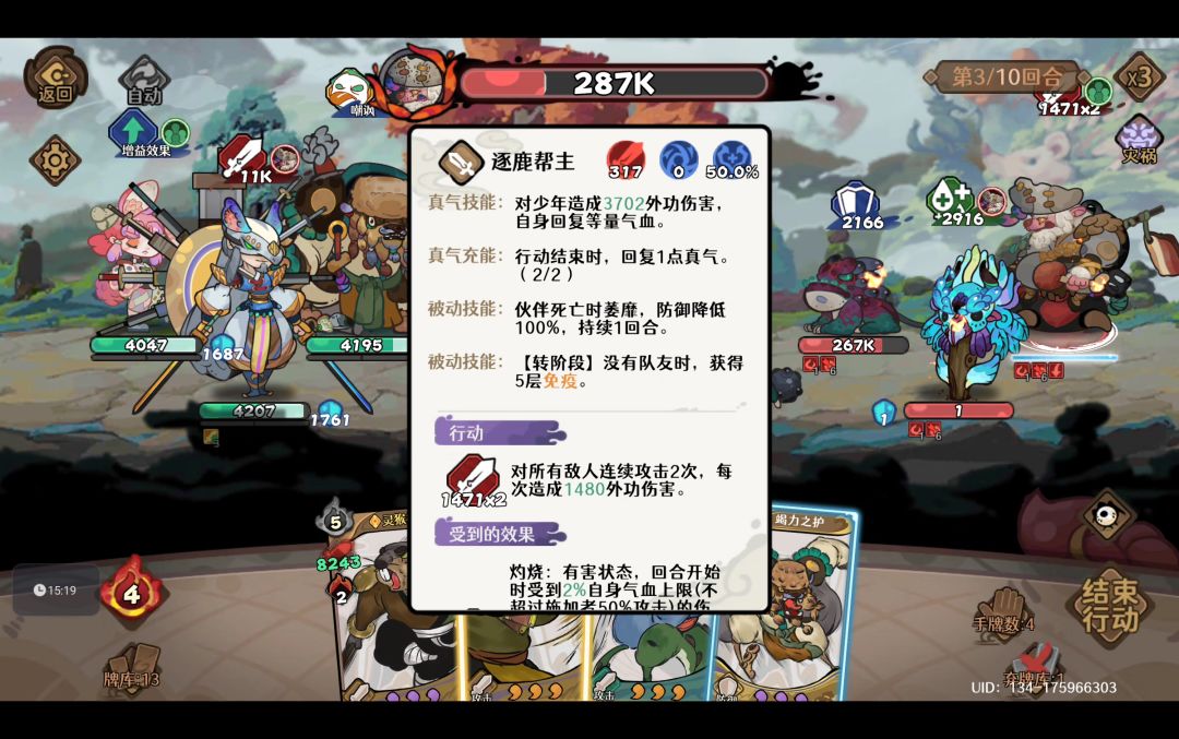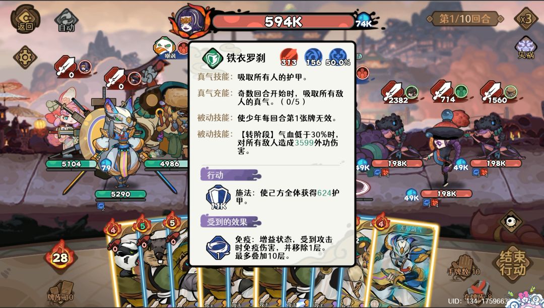 hello 各位小伙伴们,大家好 我是夜月神![表情_开心] 铁衣罗刹 真气技能:吸取所有人的护甲。 真气充能:奇数回合开始时,吸取所有敌人的真气。(0/5) 被动技能1:使少年每回合第1张牌无效。 被动技能2:【转阶段】气血低于30%时对所有敌人造成高额外功伤害。 具体打法: 铁衣罗刹的机制相比于其他BOSS算是比较复杂且难处理的类型,我们需要注意小细节也比较多。 1、敌方3号位小怪蹦蹦妹的
