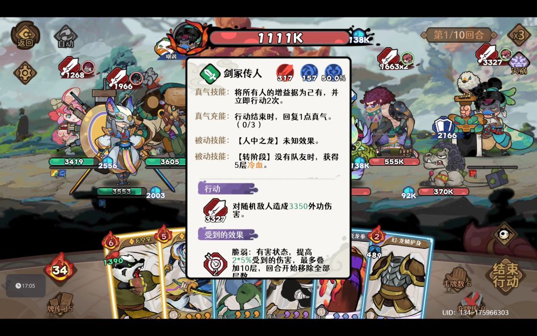 hello 各位小伙伴们,大家好 我是夜月神![表情_送花] 剑冢传人 真气技能:将所有人的增益据为己有,并立即行动2次 被动技能1:【人中龙凤】未知效果 被动技能2:没有队友时,获得5层冷血。 具体打法: 真气技能,伤害恐怖如斯!剑冢传人放大基本必造成减员,少年大概率直接被秒!由于BOSS真气技能动画巨短,所以它秒人的速度甚至比你点退出还要快!(别问我怎么知道的![表情_豹哭] 综上所述,
