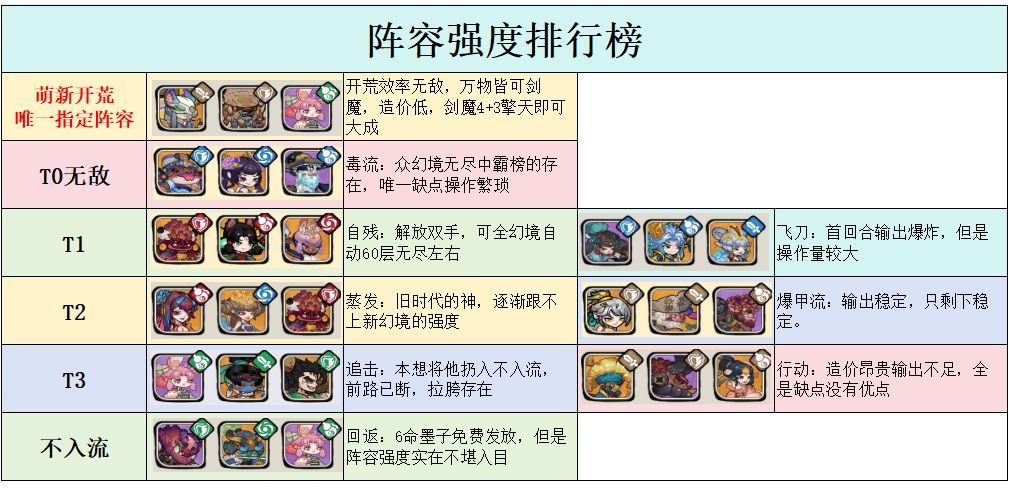 飞刀打不了的就调整,打不过的就削弱。 ——来自群友的dis 经过无数次和策划斗智斗勇,无数次加强后,策划亲儿子飞刀流终于站起来了。排行榜的战绩证明了一切。 ·阵容优点:怒气很多,无需多回合暖机,还能携带全游最强盾秋水柔劲,下限上限都有保证。在废墟篇幻境中表现极佳(适配古器、适配词条、适配幻武学)。结合未来可能出的少年装备和少年灵偶,未来可期。 ·阵容缺点:每回合都需要重新叠伤害,这导致要是一回合