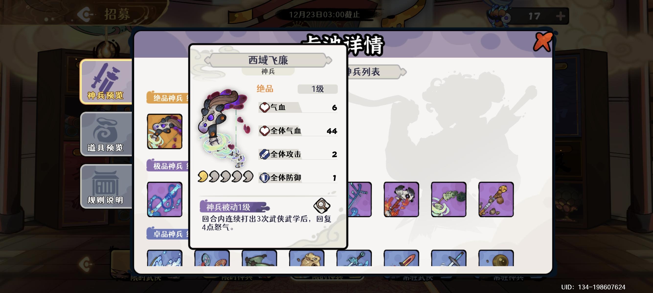 放在开头,这种周本纯纯是在消磨老玩家,劝退新玩家!可以看到,一天时间下来,能过蓬莱40的,粗略也就三十人左右,因为这40人左右里面还有些人是只有单个或几个阵容能过40,其他过不了的,ok,作为普通的月卡党,每天全勤的玩家的练度能过多少呢,先简单发一下个人练度武侠:剑魔4 传人3 无情1 鱼仙1 其他全0 除了琴心以外,武侠全满神兵:生涯5,倚天2,其他全1布偶:没搞懂,还在学习经脉:除了
