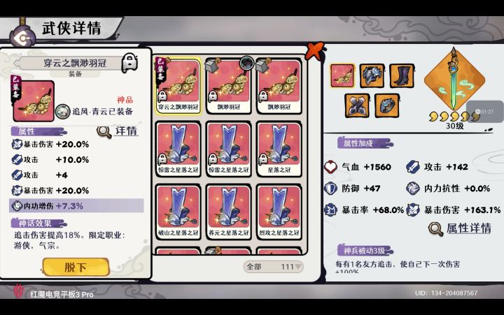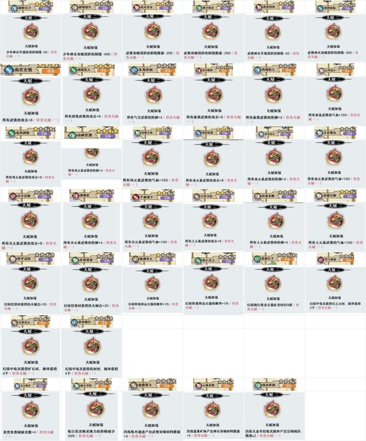 因为游戏里面经脉15级和20级点的两个角色天赋即使不上阵也可以生效,所以经脉养成就变成了一个长期的事项。经脉天赋主要分为增加战力,如增加攻击、防御和血量,还有增加养成资源的,如增加每次药草掉落、矿石掉落和幻境天赋点掉落,特殊的还会影响商店道具价格。# 通用战斗类:所有武侠攻击增加:南宫无情,所有游侠攻击增加:剑冢传人,所有气宗防御增加:东海鱼仙,所有豪侠攻击增加:炎刃修罗,这这些无论你走什么流派
