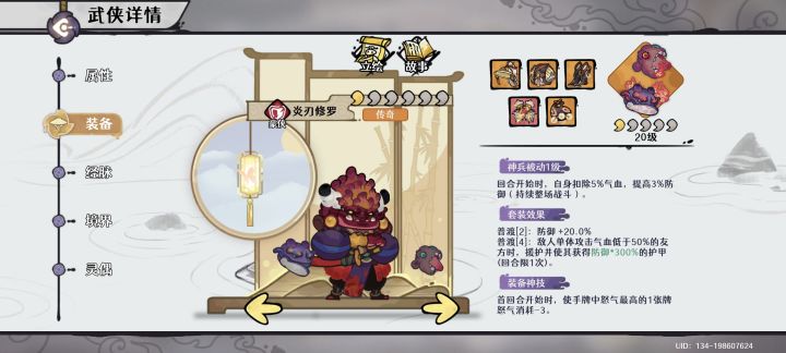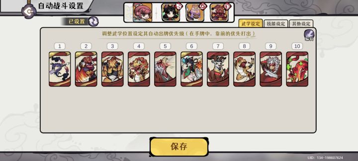 最低:弯弓2🌟,灵童0🌟,炎刃1🌟图1:卡牌选择,最后4张其实没啥用,要么是怒气太高,要么是过牌量太低,只是火系没有更好配合的牌了,凑个数。神兵:能回怒的就行(长期下来尽量抽3把通用的,以后任何阵容都能用:如赤霄,绝情,祝融)图2:自动顺序:弯弓装备升到五星,自残两次就会拿回武学,且消耗只有1怒,要优先打出,不然会浪费自残的次数,炎刃武学和破釜沉舟第二顺位打出是为了给后面的赤焰诀辅助摸牌回怒