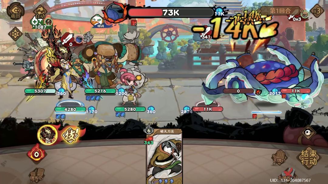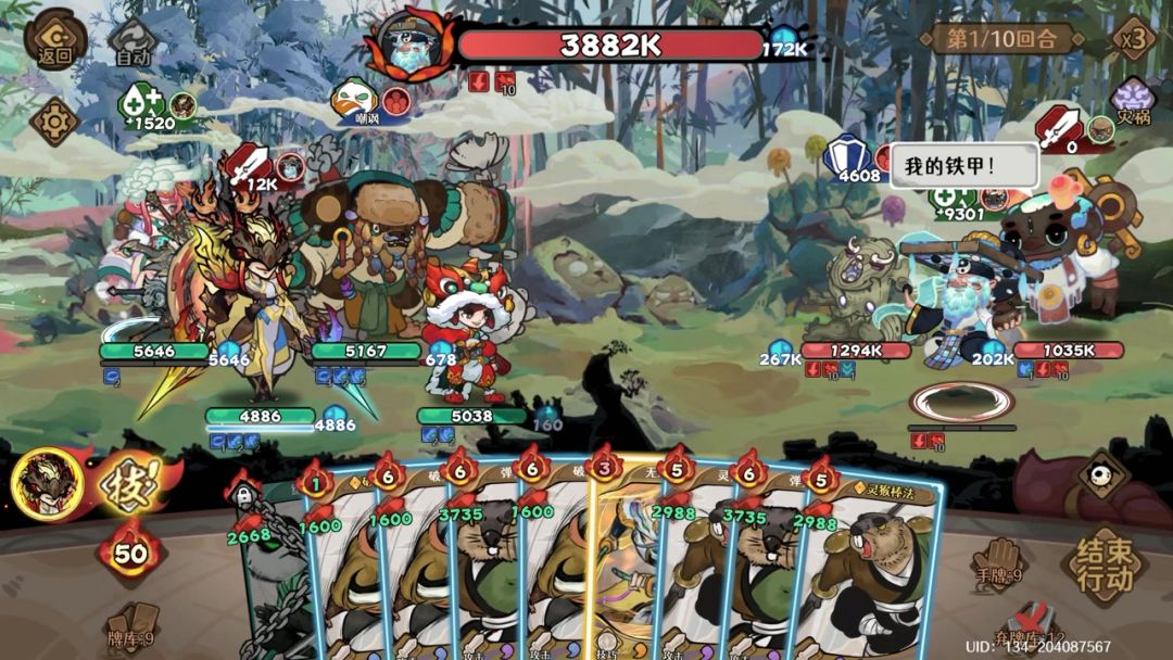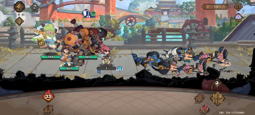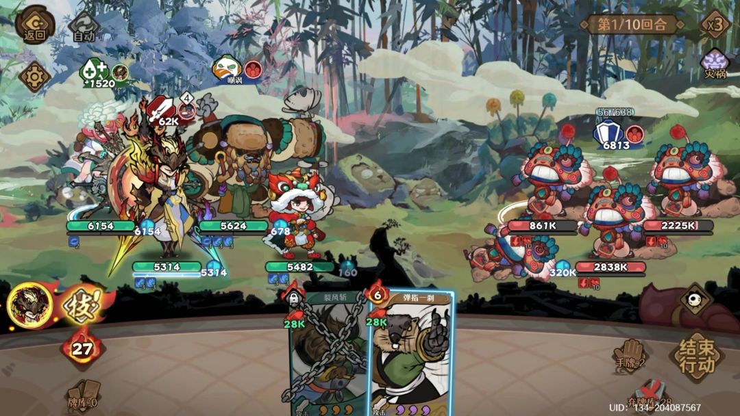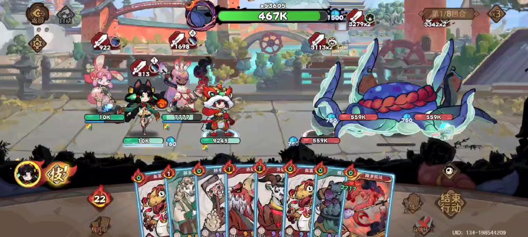 思路大概就是这样子,合理运用怒气来给弯弓叠灼烧,找准时间开两次灵童武学,通过悬壶的灵器,灵童的复活,再带上双复活头,硬拖回合拖到弯弓9999,再对章鱼哥本体开大。不过我手法是比较糙的,纯靠力大砖飞,多用用极限过牌法,叠9999的速度应该能再快点。