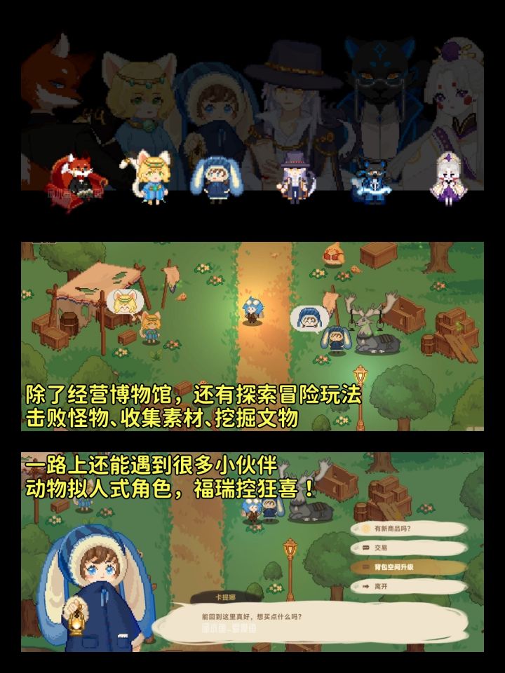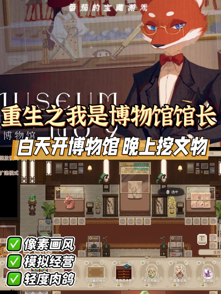 游戏状态:开放预约中游戏类型:模拟经营 像素 模拟 冒险游戏简介:这是一个人类文明消亡的时代...白天你将经营自己的福瑞博物馆,DIY摆放设计自己的博物馆展品,开房展览给游客参观,而夜晚你又将踏上搜集探索文物之路。经营博物馆,探险收集文物,冒险探寻世界之变的秘密,这需要付出不小的代价,你,准备好了吗?游戏已于今年2月上线steam,tap
