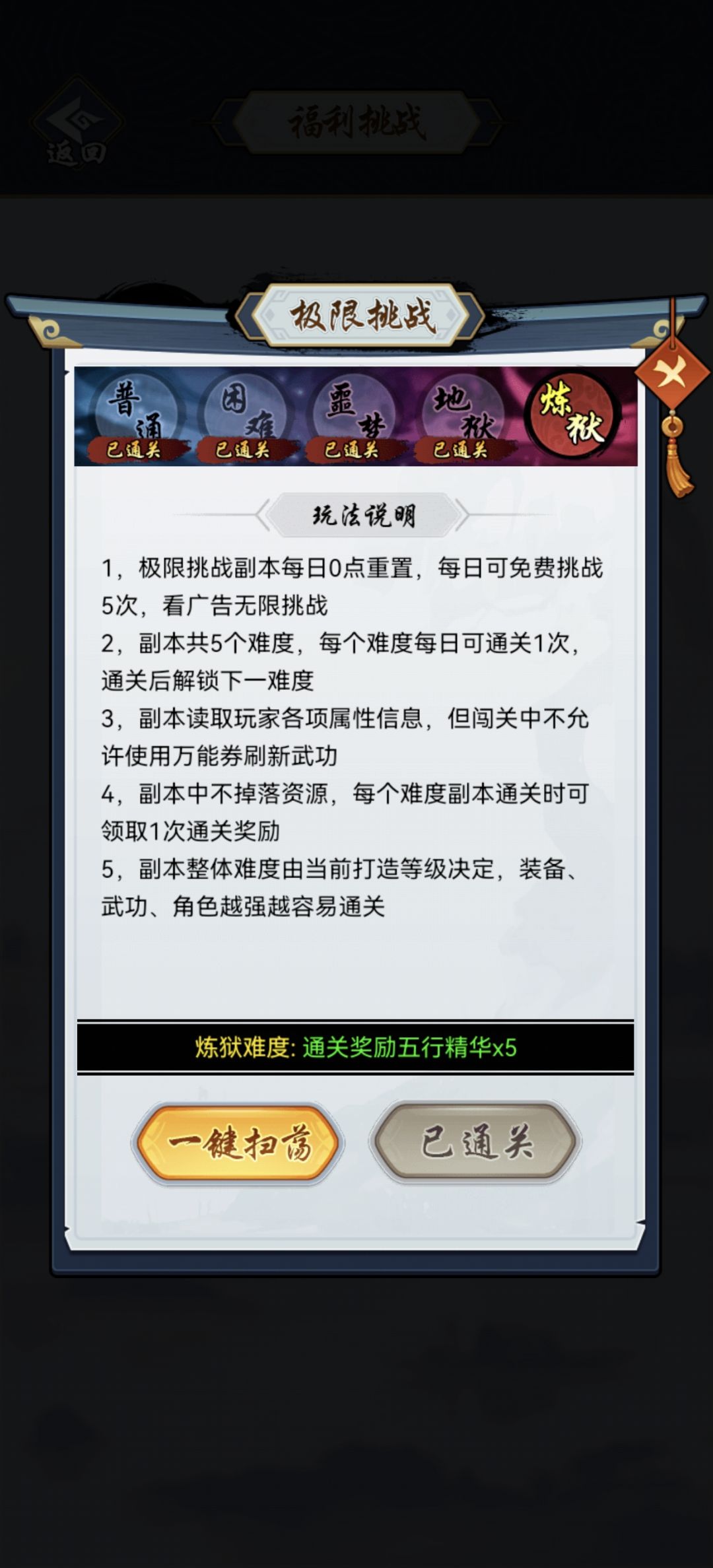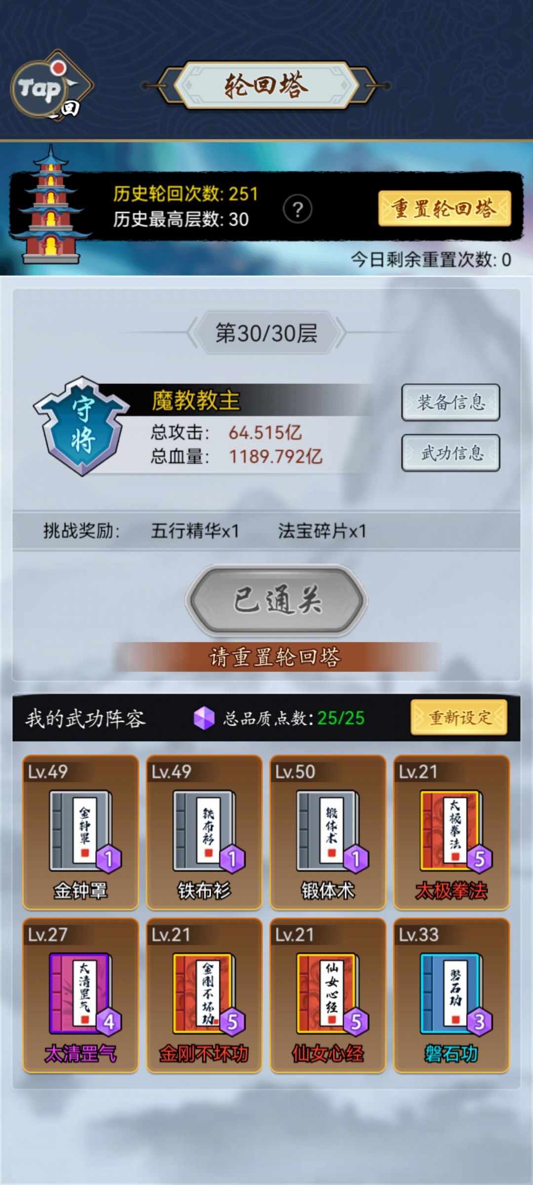 2:相信长期玩的基本都做了太极套了,不懂太极套是啥的可以去官方群里看太极套攻略。有太极套后直接6火太极套,功法就是6轻+峨眉拳+太极拳,赌狗阵容,如果你能出太极暴击一拳打死就是女娲石加随意,最好镜子,镜子给轻功加闪避。如果一拳打不死就是女娲+镜子,无脑每天打完所有次数就行了,很快就能打完了