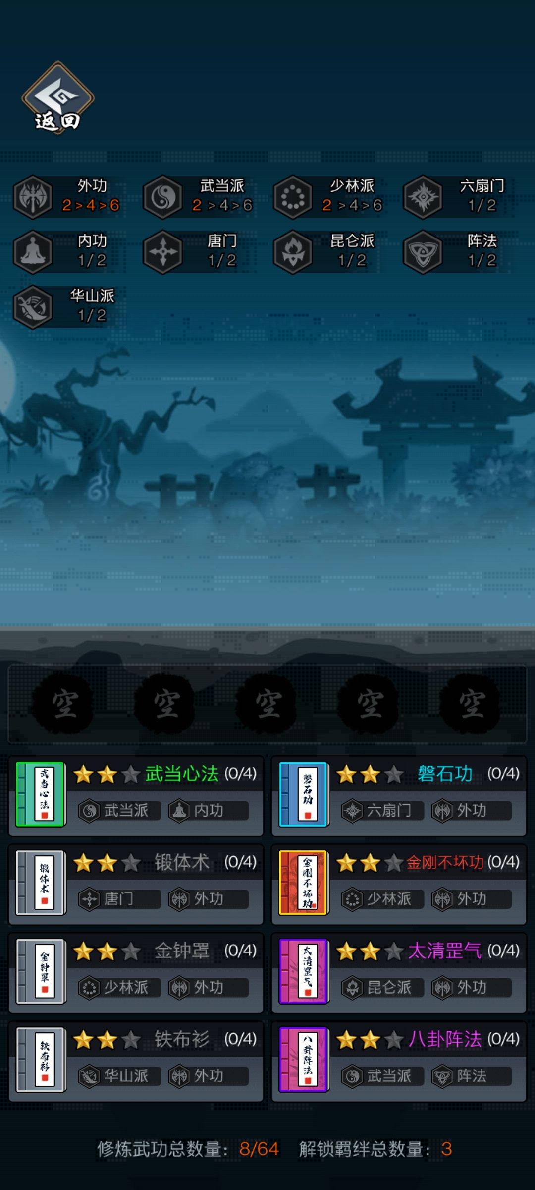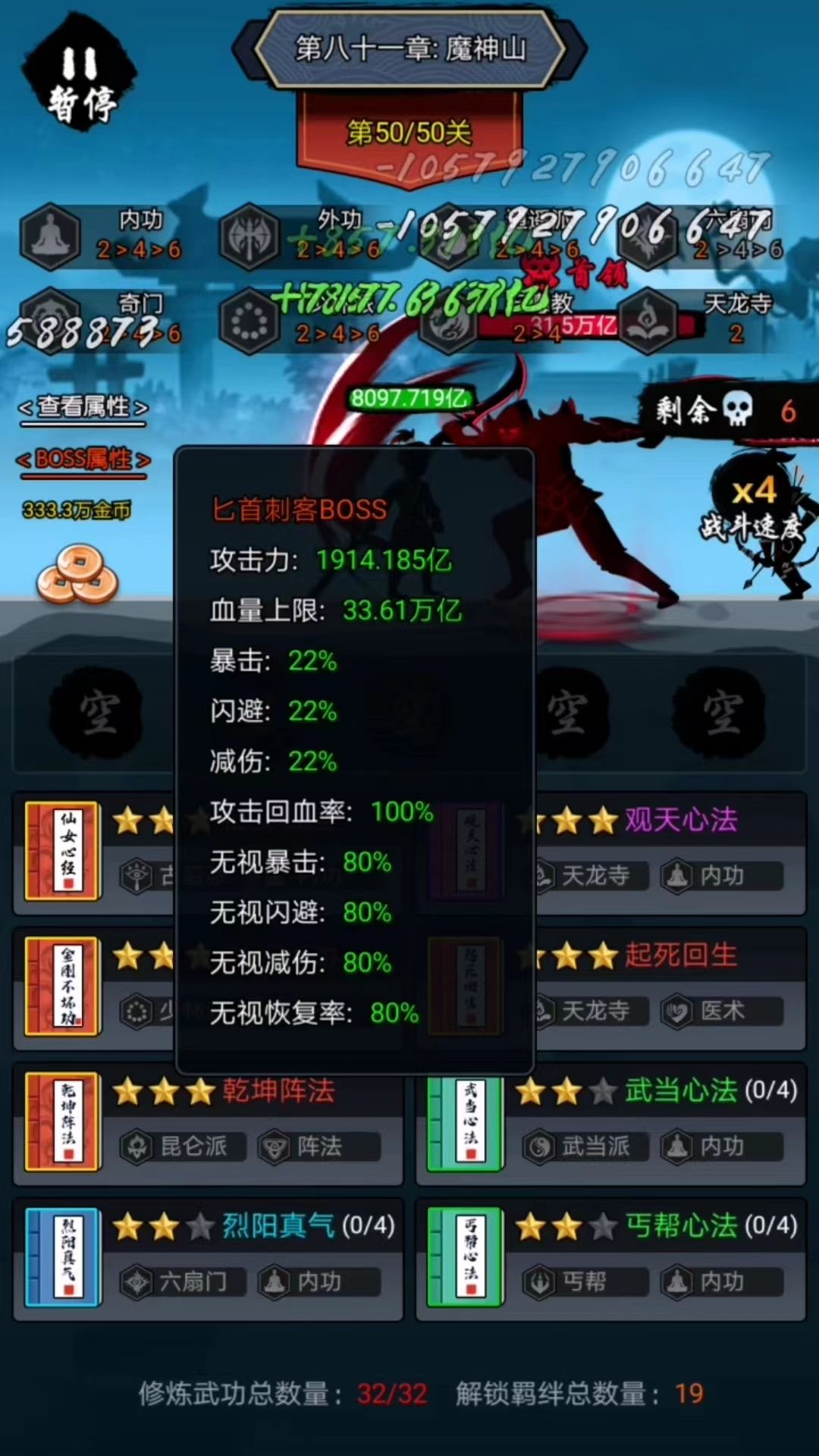 1:如果你有8外,那不用说,绝对有2星昆仑镜了,那就很简单,直接6外+武当心法+八卦阵法,当昆仑镜给武当心法后武当拉八卦,八卦拉6外直接满减伤,法宝就是昆仑镜+轩辕剑刮痧了。不过相信有8阶外的基本都通关了。