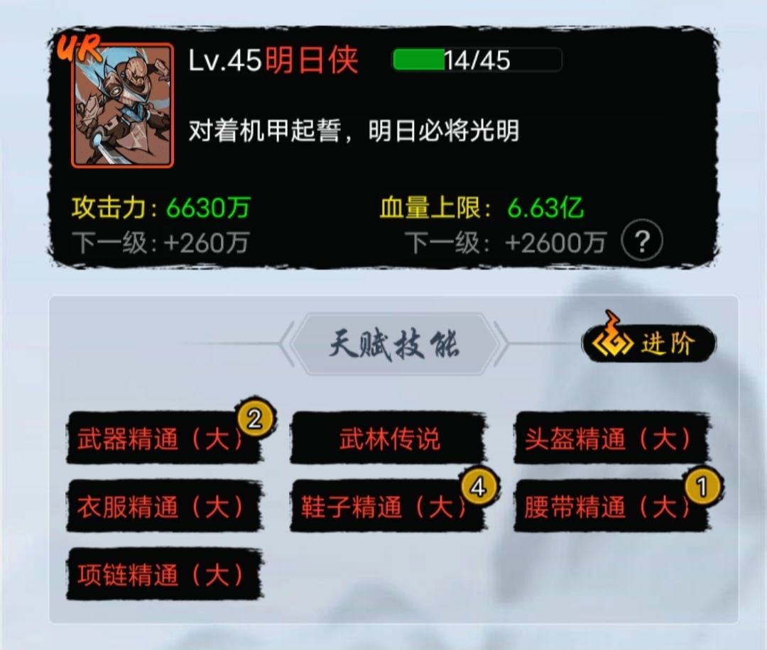 目前共上线31个角色,其中常用的只有3个ur角色。 明日侠,拥有所有的装备精通,是穿上装备基础属性最高的角色,通常用于刮痧,排名竞技。进阶推荐,各种防具精通都可,不必特意洗天赋。 郭大侠,拥有天命之子的他,是我们中后期闯关的好搭档,2级的郭大侠可以解锁精打细算,让我闯关扫荡金币更多。而拥有太极拳法的他,也是太极套闯关的好帮手。进阶推荐,天命之子,越多越好。 乔帮主,拥有战神降临的他,是所有招式套的