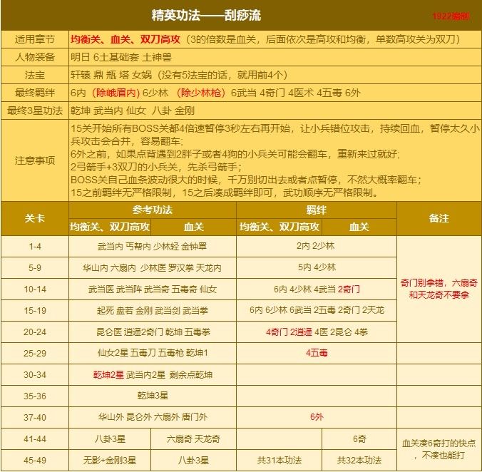 低门槛过炼狱远征通用思路简介 对于不氪648的普通少侠,远征是宝典的主要来源,即使按零氪计算,每天两次炼狱远征,平均期望都能掉落六本宝典,元宝每次也有个大几百,还是很有诱惑力的,建议尽快通关稳定收菜。但苦于远征困难等级以后,常规途径基本无法通过,考虑到远征的特点是根据少侠的攻击血量而调整敌人属性,这里笔者为大家推荐一种一拳无敌法。 先给大家提供一句话版本 前四十太极套,攻血调整1比10 四十后凑免伤,乾坤武心八卦阵 实测有效,供各位少侠参考 听笔者细细道来 适用范围:64种武功凑齐,推图通过30多章节的少侠 前置条件:最基本的4件(帽子腰带衣服靴子)8词条15%等级的太极拳词条(触发概率和伤害增加各半即可)装备。二阶以上外功羁绊(一阶外功加轩辕剑亦可) 具体步骤: 更换帽子腰带衣服靴子为太极词条装备,调整武器项链的攻击,控制自身攻击血量比例尽可能接近1比10。 武功选择上,采用笔者其他攻略中提到的暴击吸血法,优先在前十次武功选择中凑齐六刀(无天机刀法)四医(华山优先)。通过十关后可选橙武功了,第一优先选择仙女心经(必须先选,否则大概率翻车),随后选择三次太极拳(主要吃万能的地方,十五关前要凑齐),接下来尽快凑齐四剑(六剑尤佳)拳法华山六扇门随缘分拿即可(省万能)。 注意,25关前必须凑齐四枪(剩余两枪也要尽快),因为25-30-35-40关boss都需要枪法背杀。除了提到的地方,其他地方不拘泥于具体武功,重点是羁绊。从实际操作上看,控制好血攻比后,炼狱远征的容错率是很高的。 这里笔者是以突破40关为例(能使用太极突破50-60-70更佳,突破越高后续越省万能券) 第一次退出后,下次进入选择快速通关,以四十关为例,整体的思路是利用乾坤阵法,武当心法,八卦阵法的武功特点,组合减伤武功。 39次选择武功机会中 乾坤阵法3星,7次 武当峨眉心法各2星,6次 八卦阵法2星,3次 金刚不坏2星,3次,提供10%减伤 太清罡气2星,3次,提供8%减伤 磐石功2星,3次,提供6%减伤 三门白外功1星,3次 六外功二阶羁绊,提供55%减伤 妙手回春2星,3次,提供8%减伤 清心静气2星,3次,提供8%减伤 多喝热水2星,3次,提供6%减伤 逍遥任意2门,2次 注意乾坤阵法应在除逍遥武功外全部达到既定目标后点选升三星!! 以上,39次选择武功,101%减伤达成 特别提示,以上为无法宝状态 如果带轩辕剑,2逍遥可更换凑成任意一门二星白外功,降低后续难度(直接升三星,后续可以少选四次) 如果法宝带了昆仑镜,能多一次武功选择机会 接下来四十关后就无需赘述了,按顺序点满能提供减伤的医术和外功即可,确保60关前凑齐110%免伤,110关前凑齐120%免伤,160关前凑齐130%免伤 笔者以炼狱远征为例,前面的四个等级难度更低容错更高,各位少侠参照处理即可。