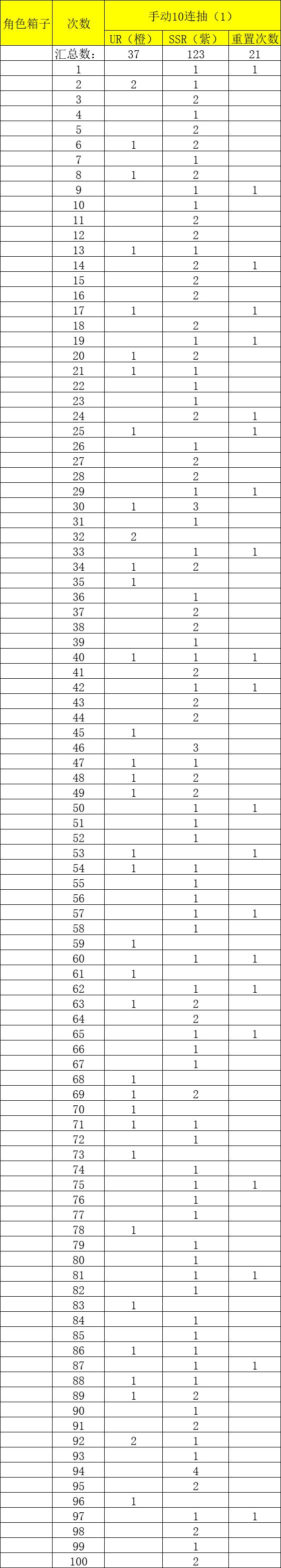 本着没有数据调研,就没有发言权,我亲测了角色宝箱,同等元宝9万,10连抽和1000连抽的数据,看一下结果如何? 好,那先说一下测试结果(具体看图): 1.在角色宝箱十连抽,UR(橙)的数据平均在35.67个,SSR(紫色)平均在118.67个,剩余数据由蓝、绿、灰卡补位; 2.在角色宝箱千连抽,UR(橙)的数据平均在40个(固定),相对十连抽多了平均4个左右,而SSR(紫色)平均在68.5个,相对
