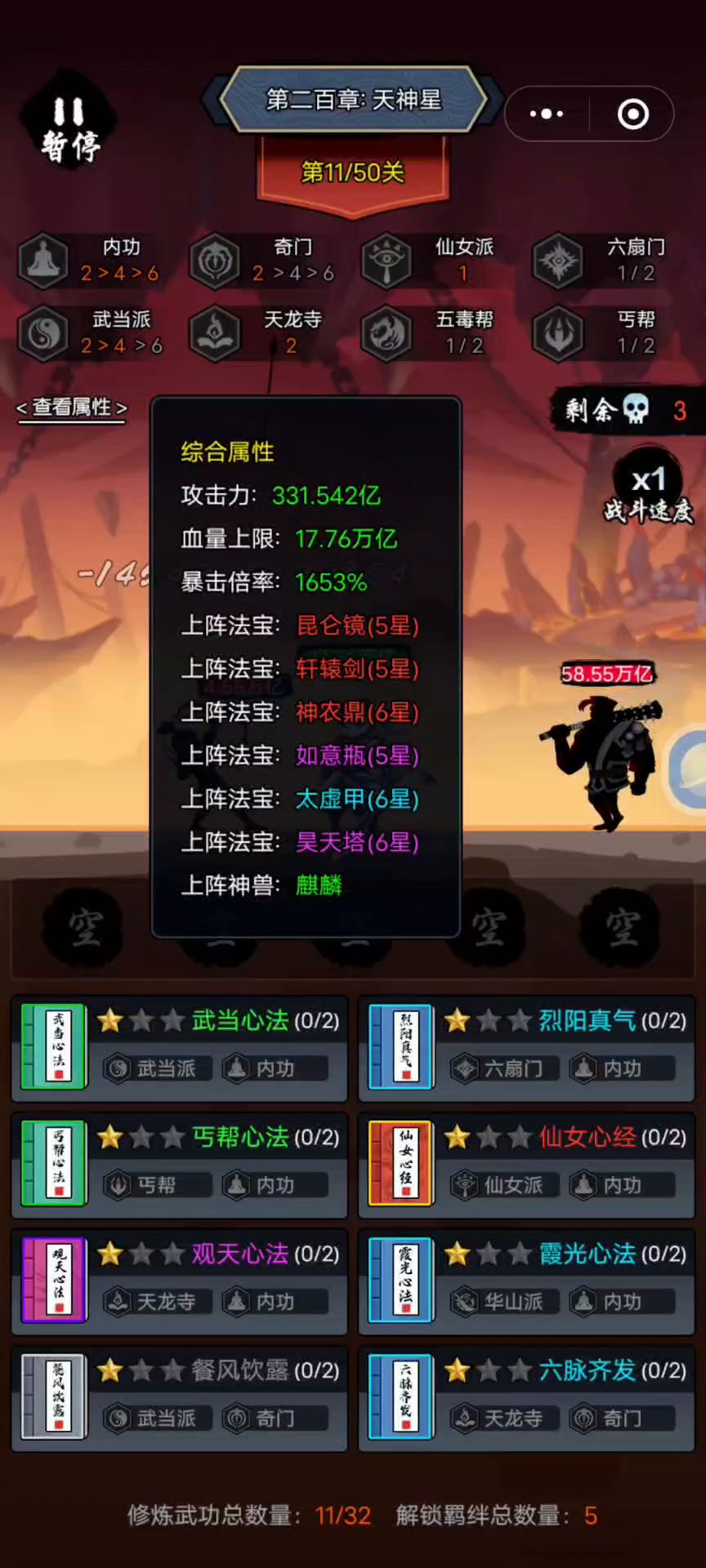 有没qq或者微信,想问一下183怎么过。卡183第50关。没有任何门派有觉醒。要怎么拿功法