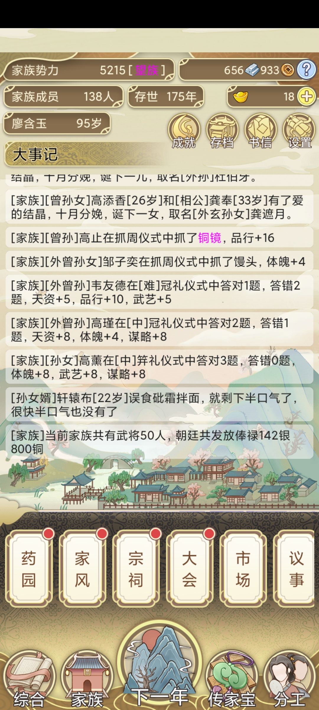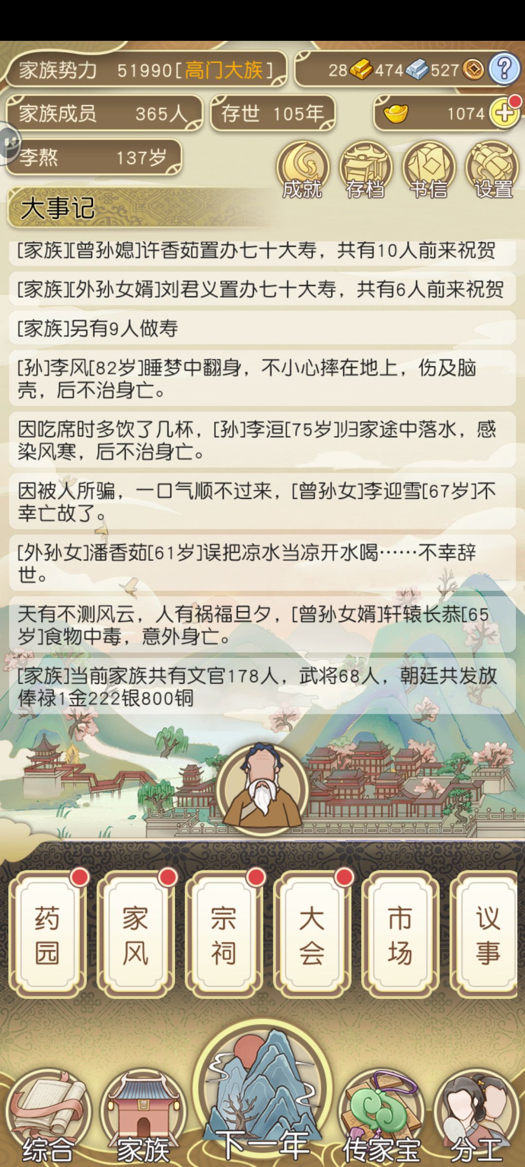 这是一款文字类型的模拟经营游戏——祖宗模拟器。你是否想要望子成龙,望女成凤。那么这款游戏,让你成为家族的一家之主。按照你的思路经营你的家族产业和养育后代子孙,家族的兴衰掌握在你的手里,下面让我们一起来看看吧。 游戏十分的简单易懂,我们要在这一年中,解决这一年中出现的紧急事件,记得破财消灾就行,能拿钱过去的事情都不是事,让后代完成习武或者修文两项任务,提高武艺或者是文采,能力出众的子孙走仕途或是入伍