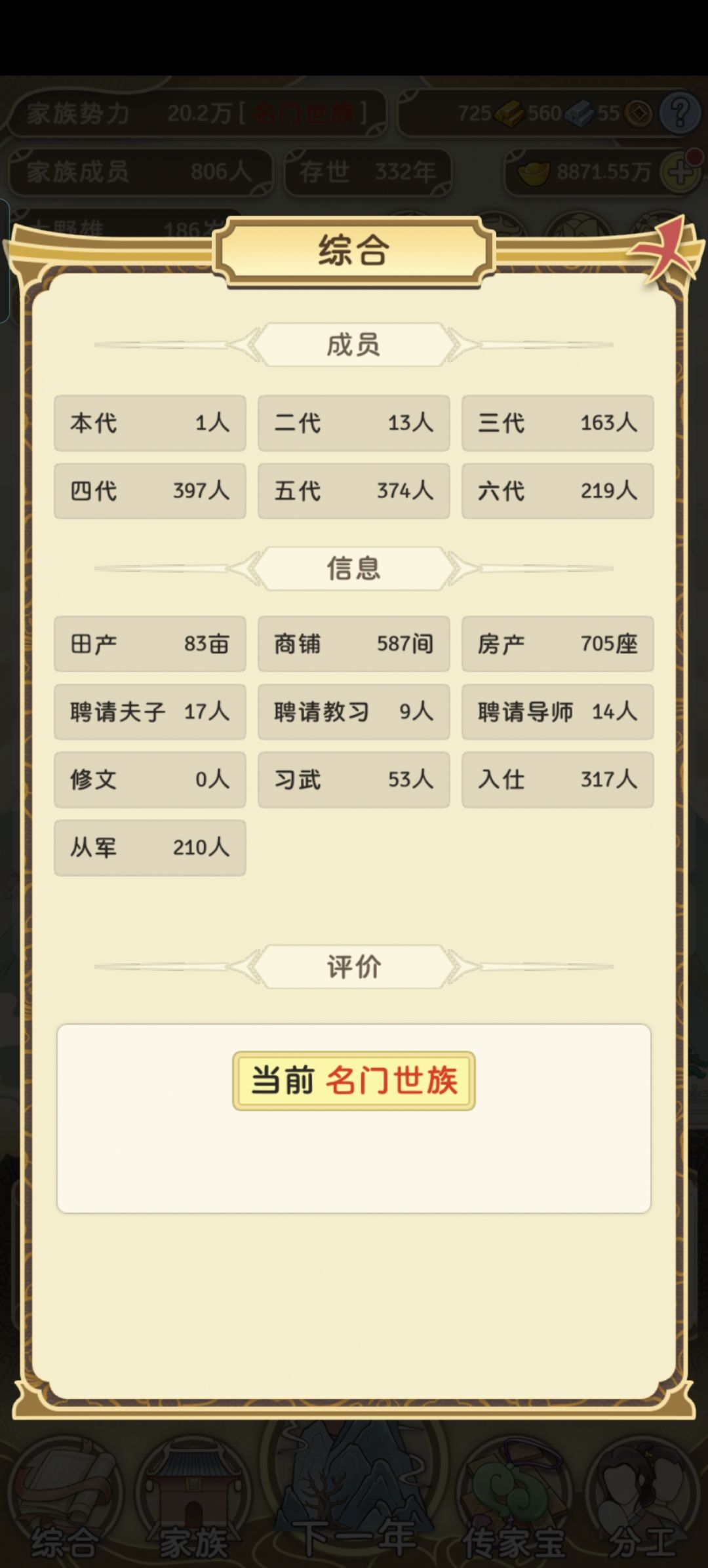 第一任家主主要就是拼命生娃,开枝散叶,产业只买不卖,多赚钱,活到100岁左右尽量把老师请满,药园留着。 然后选个人口少的继承人,不超过三人,哪样老师随机三人基本就百分百,每年属性点都能增两百多。武将或文官属性超600,大会第一,年年都能升官。 二代培养到20岁当官,极限操作还不用30岁就一品了。 后面人口多了属性就增长慢了,看你玩这个追求什么目标,想快速提势力,还是要人多势众 #欧皇附体