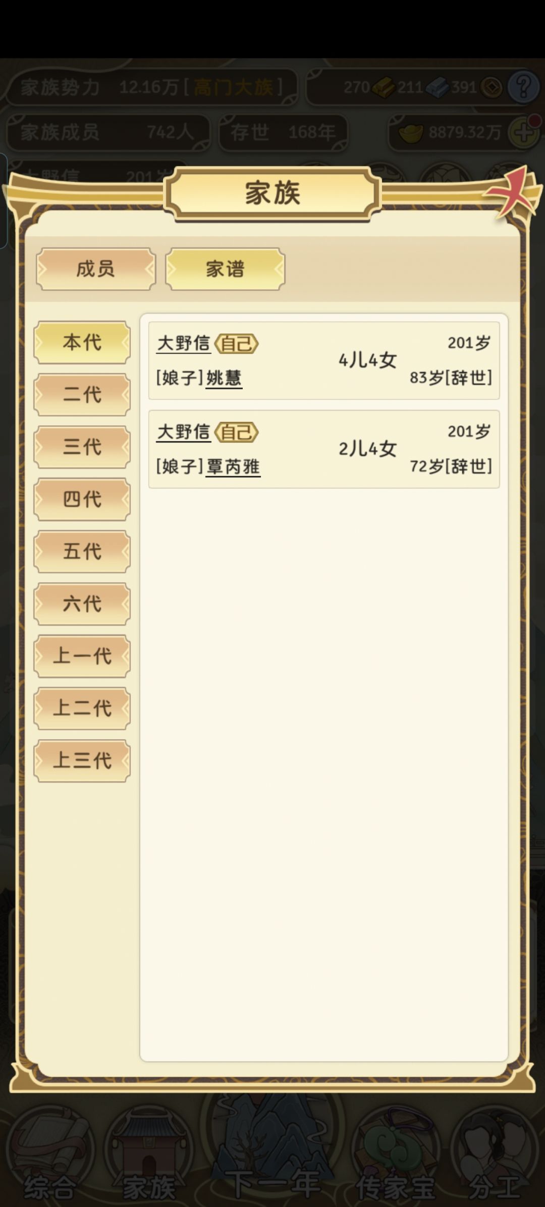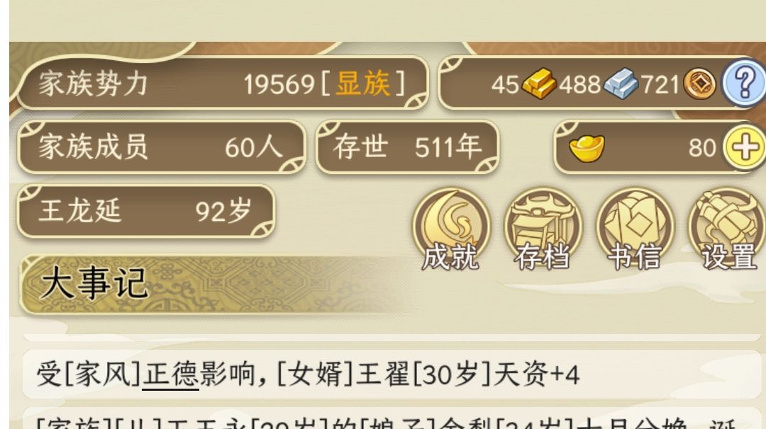 游戏莫名上头 玩了3天 广告看麻了 思路清晰了 才想起怎么能不看广告的事 玩游戏是玩的思路 想到这3天遭的罪 意难平 思路如下: 1 目标 势力值 2 势力值分两类: 一种是生子结婚寿宴 势力影响一直都在 可传承 称之为实 一种是入仕从军 退休就没了势力影响 支系不可传承 称之为虚 无论虚实,想在每代家主获得更多的势力值,都必须有更多的人丁,所以要尽可能的生育,20岁结婚生子从军入仕是最核心的,