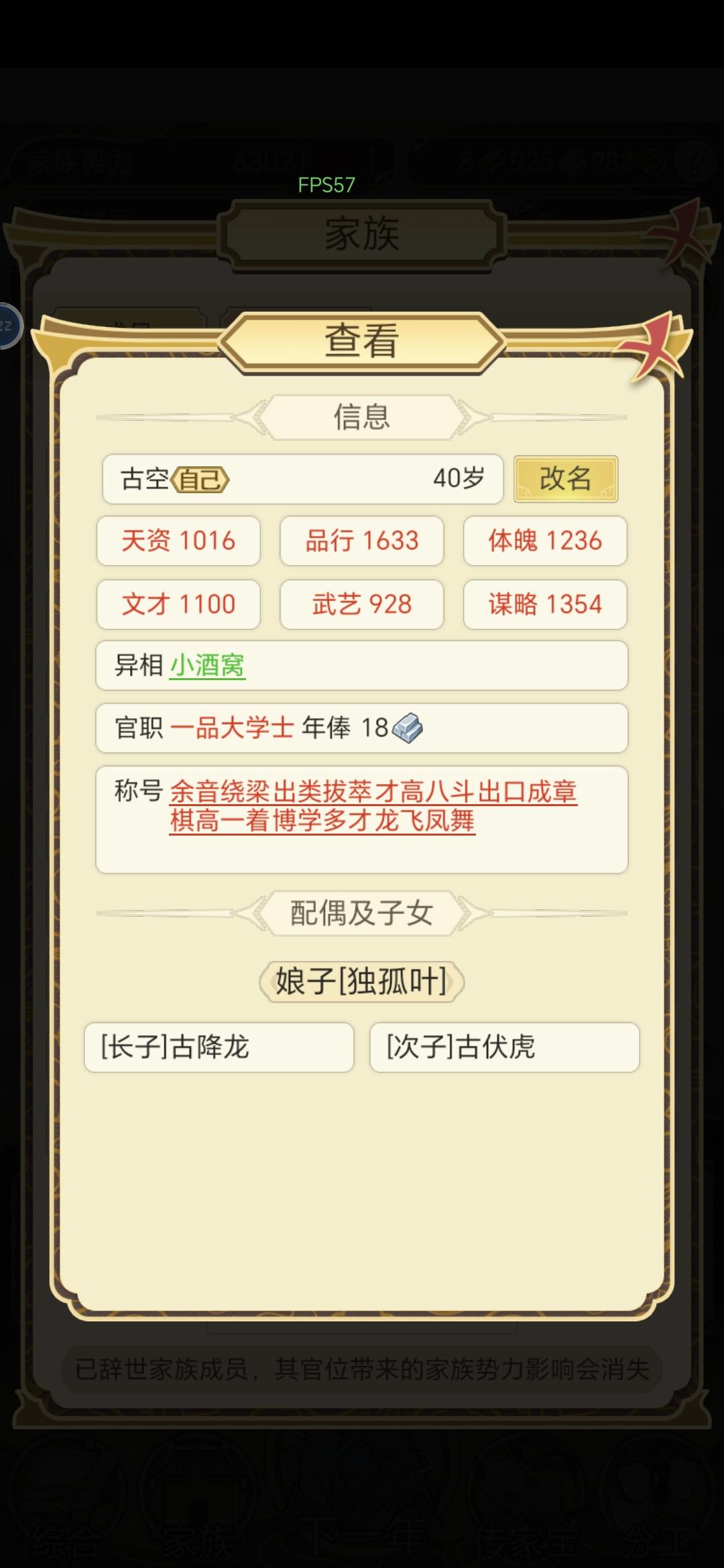 总的来说,永久家族势力主要靠生孩子,精养出来属性特别高的新生儿给的势力多,但是大家族的时候再量产很困难,不如摆烂快速过回合;临时家族势力主要靠二三品官员数量,个人经验家族最多600人,精养的话能提供不到50000临时家族势力。为了冲20万档的家族名号,可以在摆烂攒了15万永久家族势力的时候精养一波