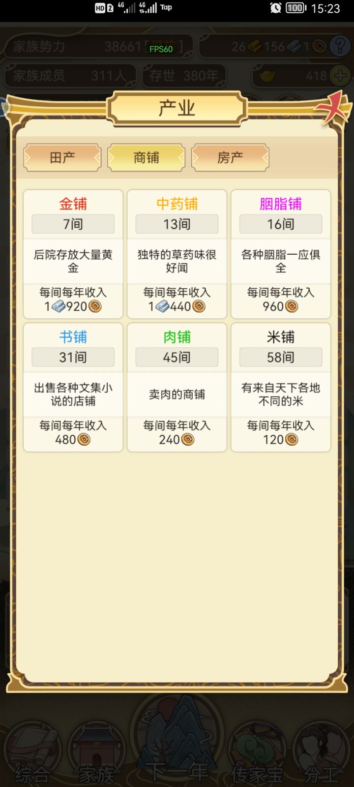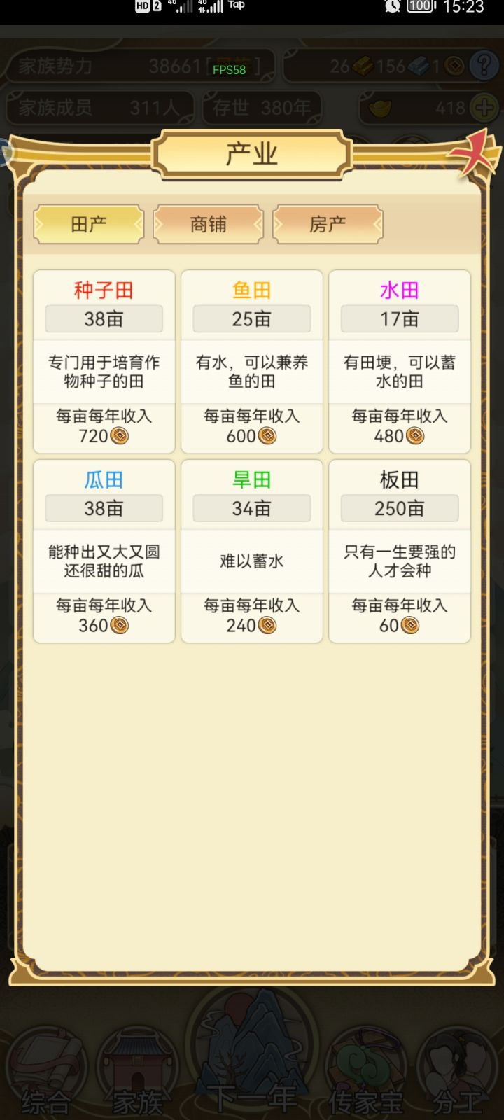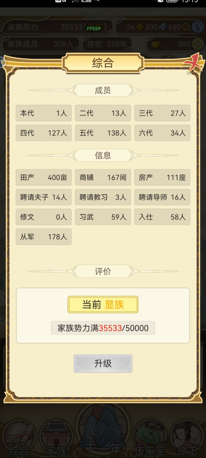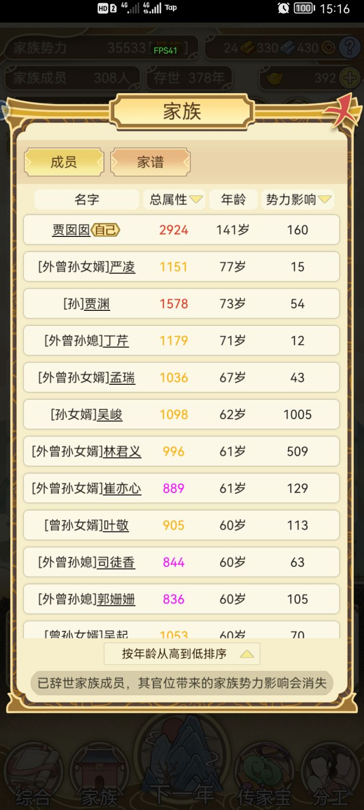 不间断肝了两天,手机肝的烫手。总结一下,元宝主要靠生孩子,除了宗祠其它不用,宗祠刷满很重要。自家生的娃全部习武,20岁后参军。天下里面相亲的有金色属性优先,其次选能入仕的。关于跳涯我搞了一段时间没出现传家宝,后面就全都搞钱了,30金后可以全跳。议事全部选同意,有几率出现传家宝。 家族300人后面太卡了,而且都是套娃每年耗时太长了。药园里的药可以给自己吃加体魄优先,不过我的都没吃过,全部存起来了。最