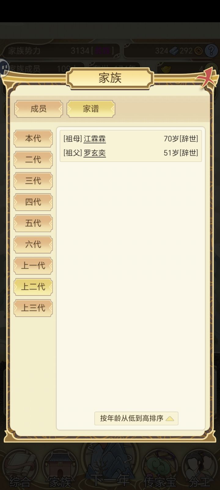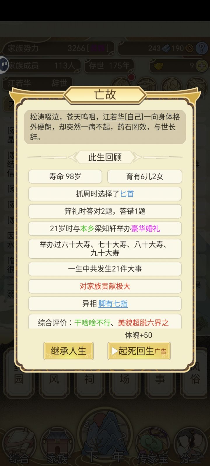 我只能说,这游戏虽然每年都有些繁琐重复,但是处处有惊喜,挺上头的,打开游戏第一次玩了好几个小时才退出去,有没有人知道年度大事,家族中有个成员拿到了元宝,但是好像元宝都不见涨啊,是我的问题还是游戏的问题啊。。。