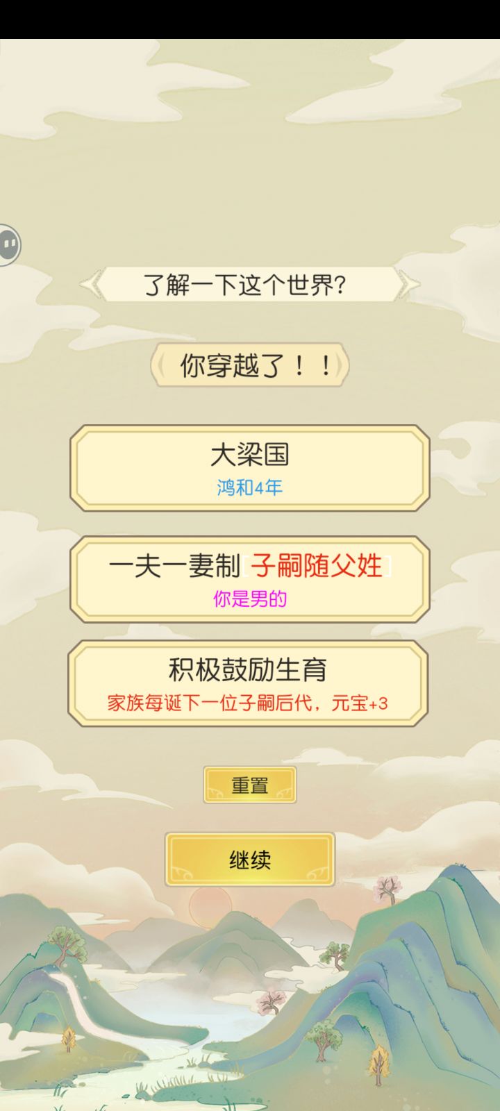 开局就有一万元宝,每个人都可以的最强最完美开局!详细攻略!1.最完美的开局一定要选生子元宝+3的,不要选其他的,因为收入来源主要是当官而不是靠产业,后期不缺钱;而且要选男的,跟随父姓。选女生50岁后就不能生育了,比男生劣势,当然随便玩玩都可以,但是要选生子元宝+3的,因为游戏里元宝没有收入来源,元宝后面用处很多,会越用越少的。2.自己的基础属性尽量刷好一点,一定把姓氏和名字要选好,年龄大小看