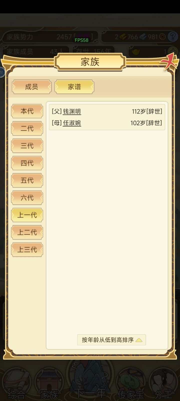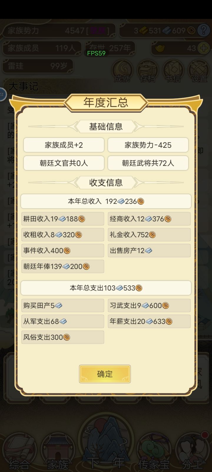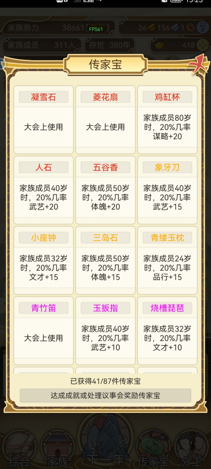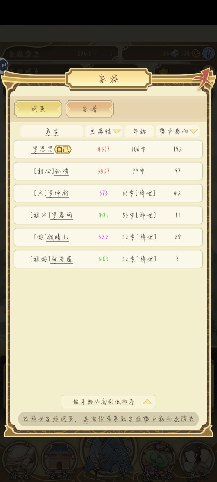 不间断肝了两天,手机肝的烫手。总结一下,元宝主要靠生孩子,除了宗祠其它不用,宗祠刷满很重要。自家生的娃全部习武,20岁后参军。天下里面相亲的有金色属性优先,其次选能入仕的。关于跳涯我搞了一段时间没出现传家宝,后面就全都搞钱了,30金后可以全跳。议事全部选同意,有几率出现传家宝。 家族300人后面太卡了,而且都是套娃每年耗时太长了。药园里的药可以给自己吃加体魄优先,不过我的都没吃过,全部存起来了。最