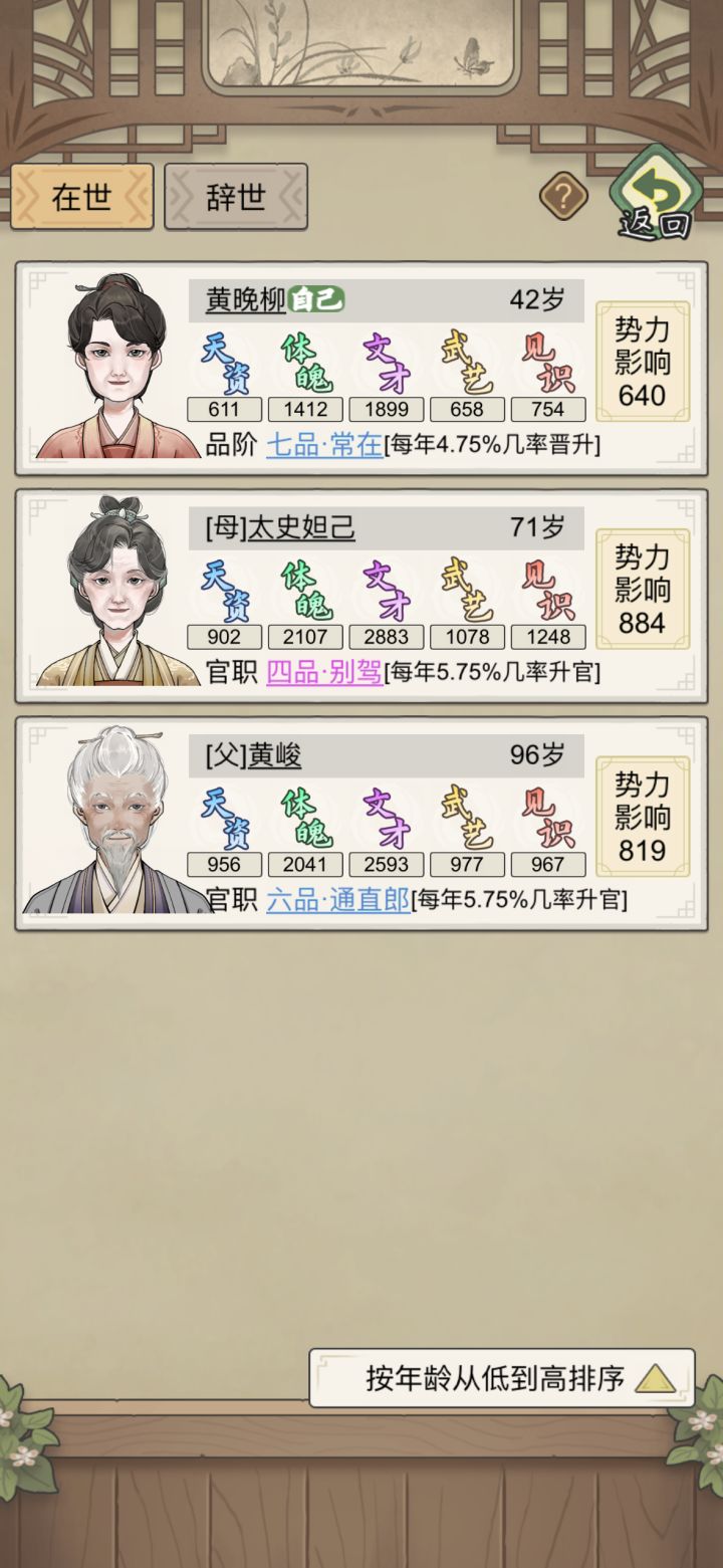 前期你会在100岁之前去世三四次,你都要看广告救自己,作为第一代家主,还是要善始善终,起码百岁以后,妻子也是,前期不用娶二房,因为你的属性还很弱,生不了很好的后代。