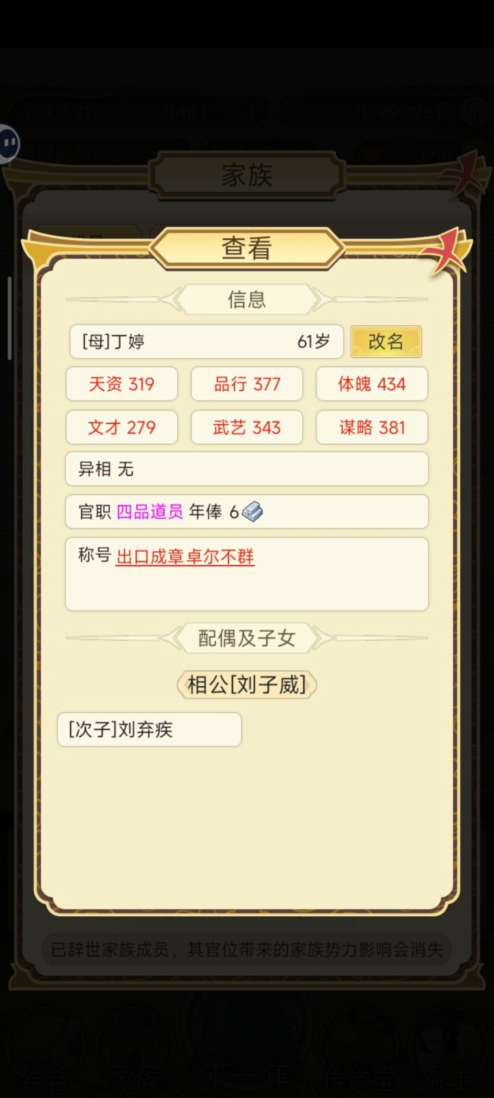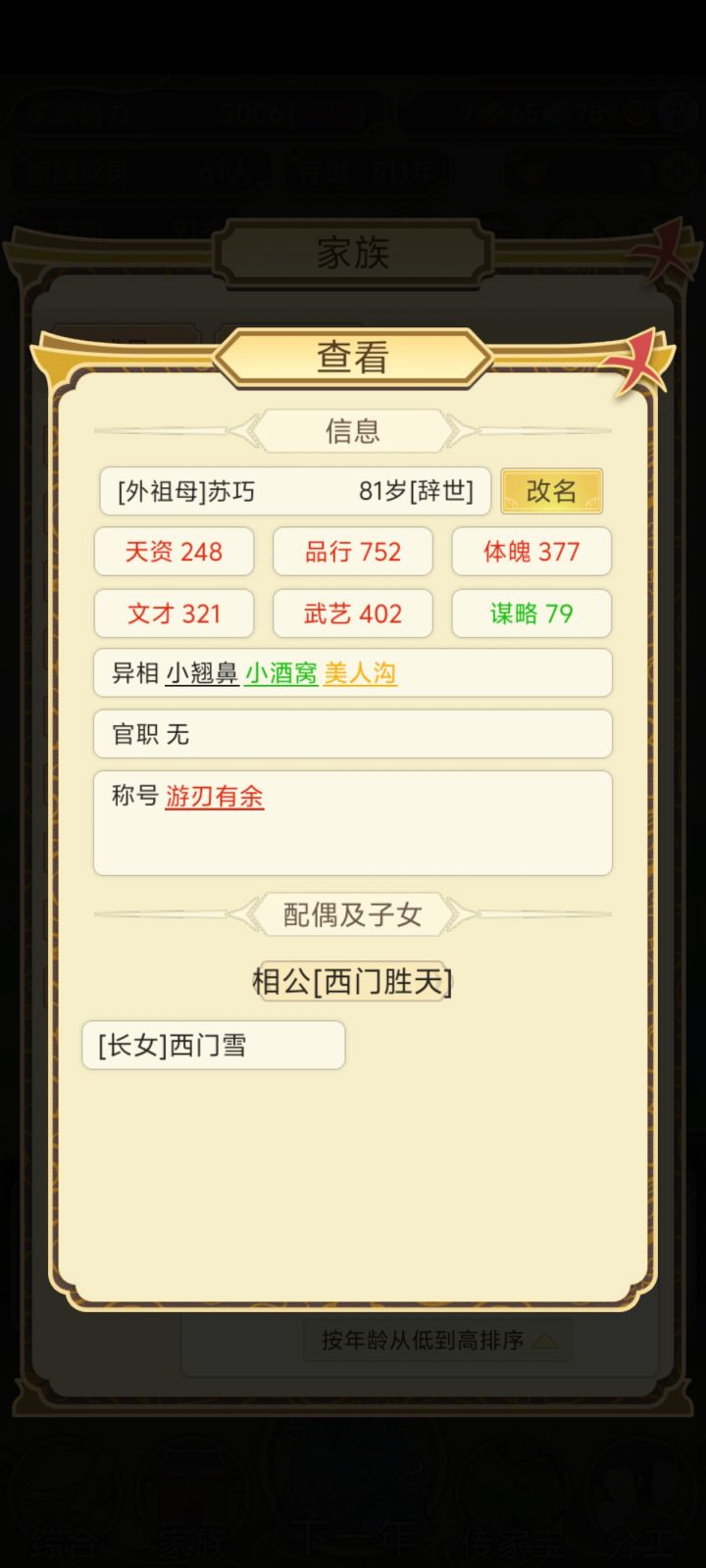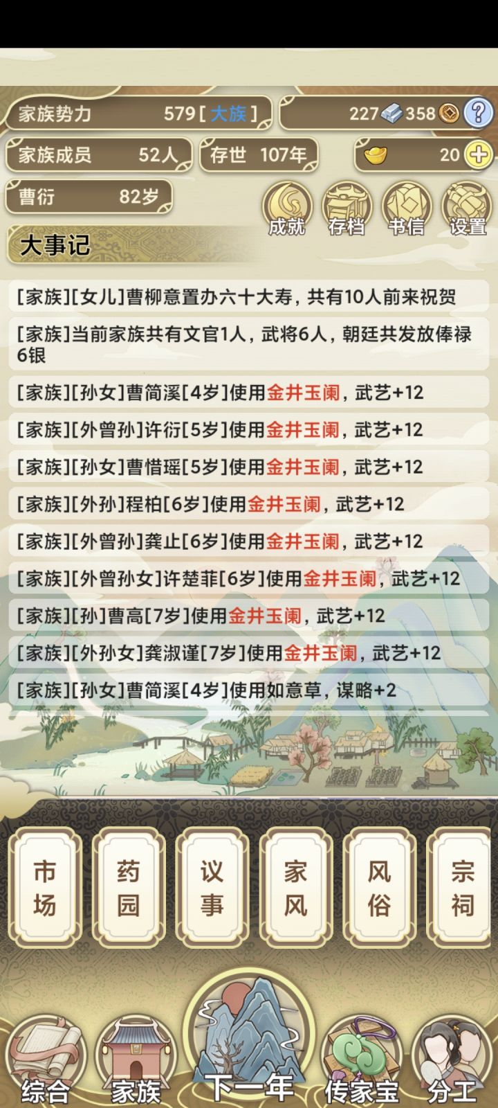 我只能说,这游戏虽然每年都有些繁琐重复,但是处处有惊喜,挺上头的,打开游戏第一次玩了好几个小时才退出去,有没有人知道年度大事,家族中有个成员拿到了元宝,但是好像元宝都不见涨啊,是我的问题还是游戏的问题啊。。。