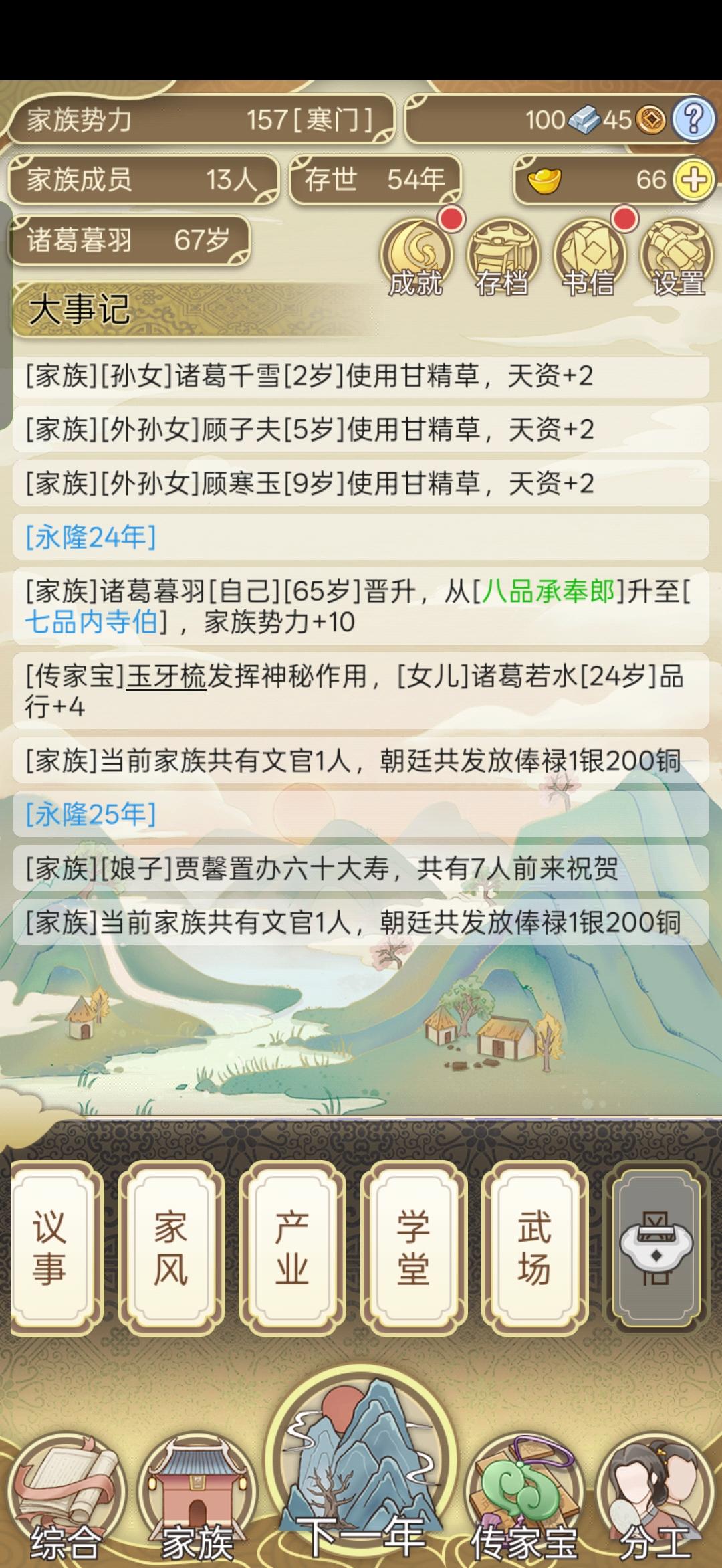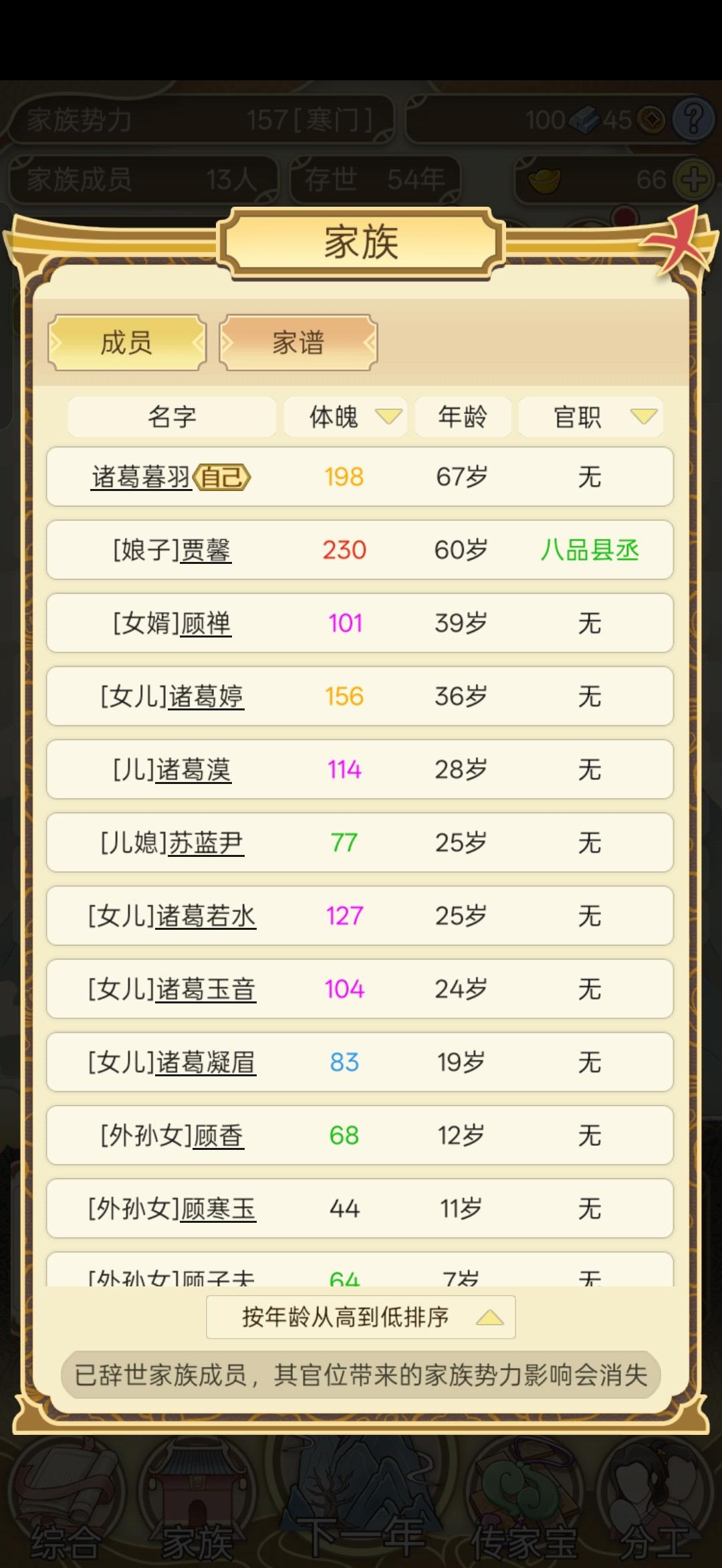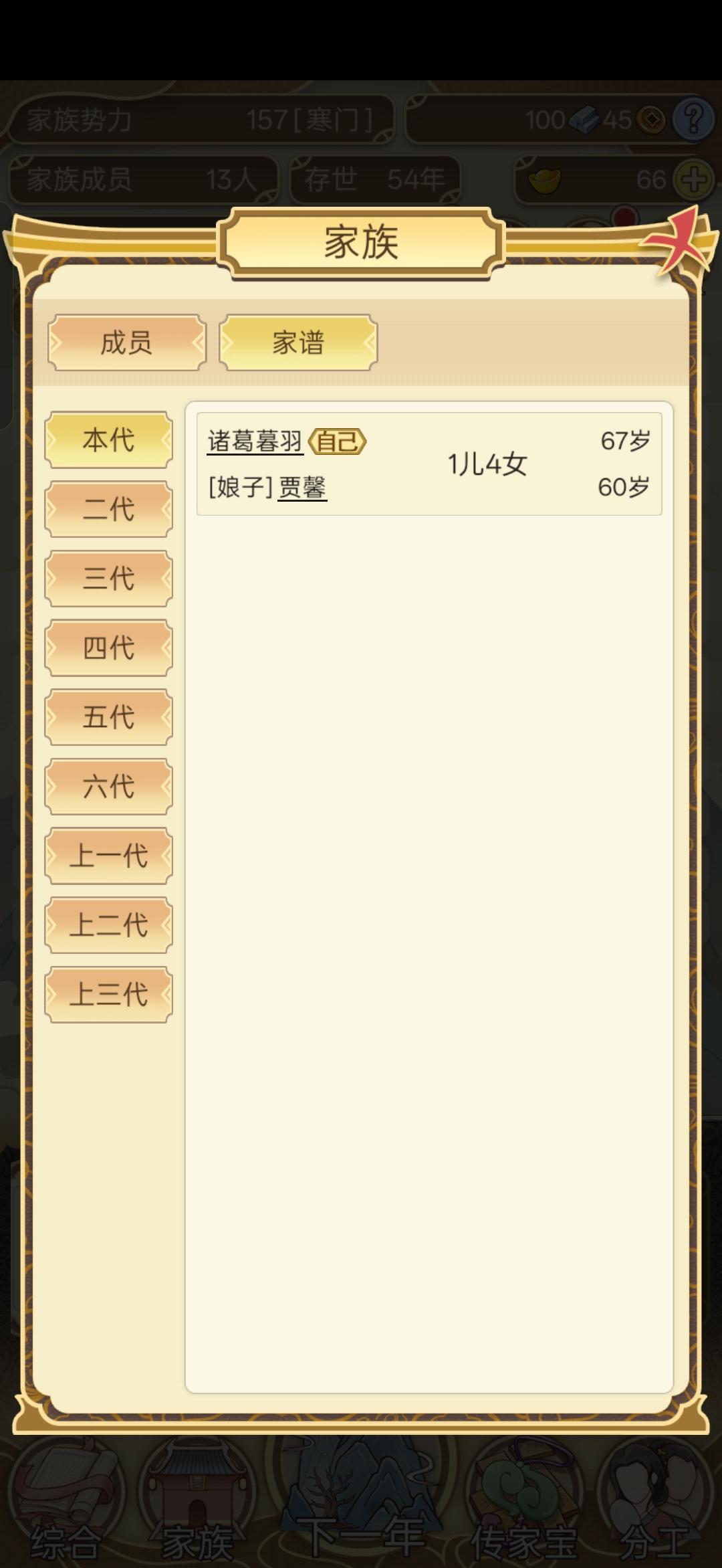 我只能说,这游戏虽然每年都有些繁琐重复,但是处处有惊喜,挺上头的,打开游戏第一次玩了好几个小时才退出去,有没有人知道年度大事,家族中有个成员拿到了元宝,但是好像元宝都不见涨啊,是我的问题还是游戏的问题啊。。。
