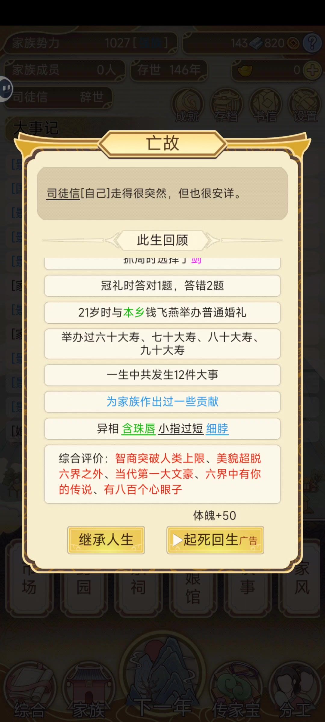 继承的时候不小心选了没有儿女的,然后直接修仙了,现在死了,,发现没有儿女,不能结束游戏,我这是卡关了?