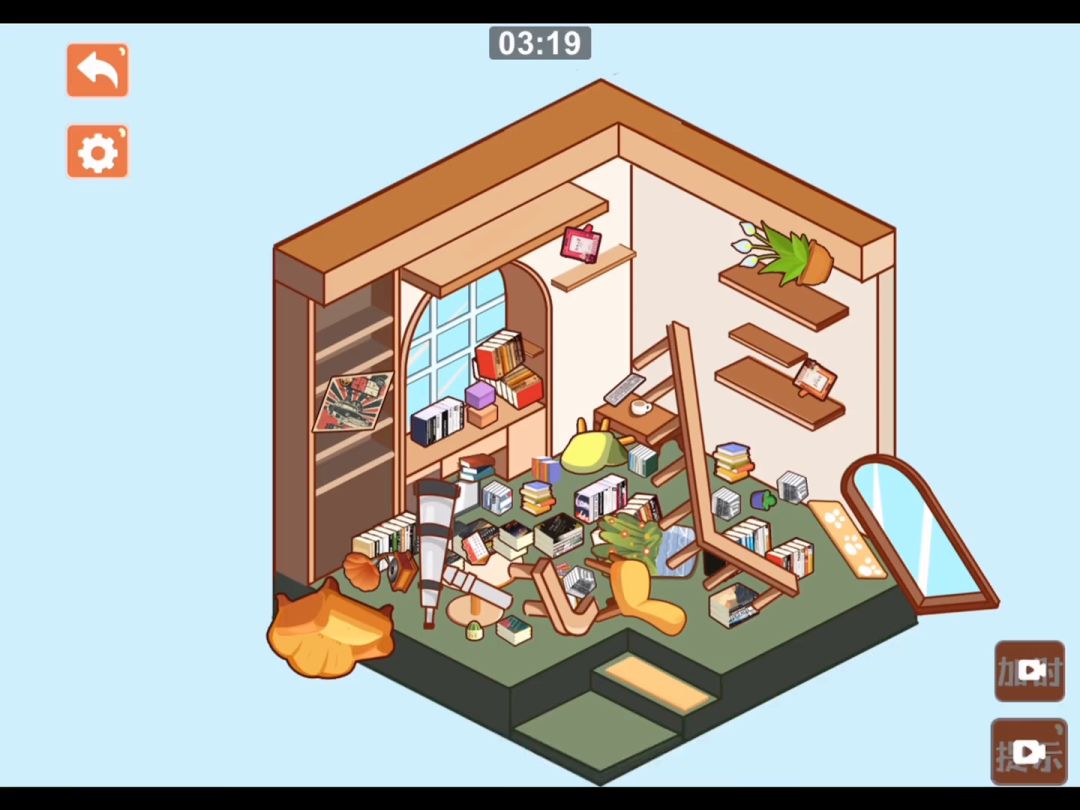 第一步:拖动四幅画墙上便会出现位置提示,根据提示将四幅画挂在正确的位置 第二步:将两个紫色的箱子摆放在衣柜上面 第三步:将包含“ABC”的大正方体和故事书摆放在最上方的木板上,再将小方块“A”“B”“D”依次摆放在下方的木板上 第四步:将花瓶摆放在柜子上,再将白色的玩偶放在柜子旁边的沙发上 第五步:把两个火车车厢连接在左下角的火车后面 第六步:将右下角的木马放在左侧的垫子上 第七步:将安诺塔按照由大到小的顺序从下往上堆叠摆放 第八步:将剩余的方块、三角块、汽车和两个相同样式的玩偶摆放在中间下方的和箱子里,本关完成
