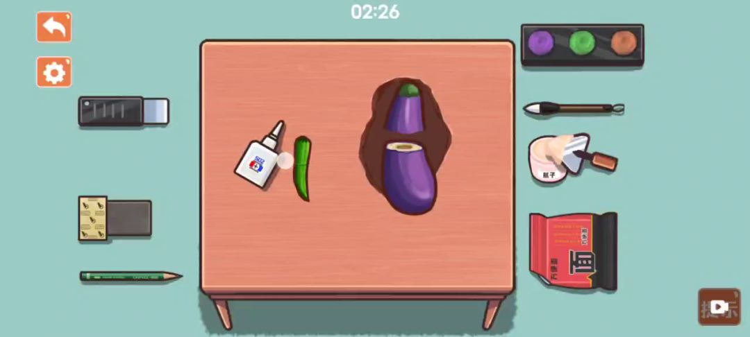 第一步:修复青椒——将红色的卷纸放入青椒当中,合并青椒,用502把缺口处缝合,再用左侧第三个位置的磨砂纸打磨,然后用颜料笔蘸一下绿色的颜料涂在青椒缺口处。 第二步:修复茄子——将青椒放入茄子中,合并茄子,用第一步中的相同办法修复茄子。 第三步:修复桌面——将茄子放入桌子坑洞中,倒入方便面,在方面便上涂上502胶水,再用左上角的锉刀打磨一下,涂上腻子,用颜料笔蘸一下颜料给坑洞处上色,最后再用铅笔涂抹一下就完成本关啦。