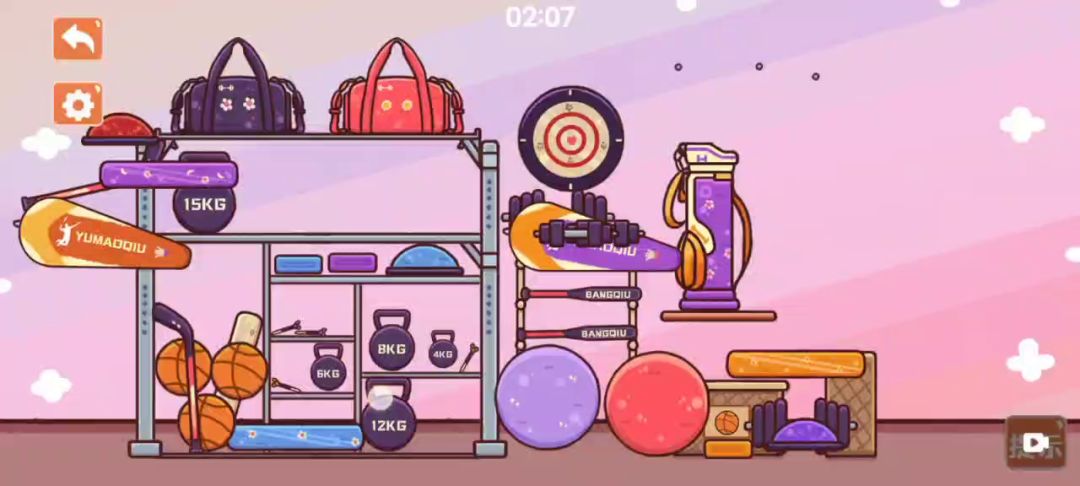 第一步:将两个大手提包放在架子的最上端 第二步:将铁球按照重量由重到轻从左到右摆放在左侧架子上 第三步:将两个瑜伽球摆放在架子左下角的位置 第四步:三个半圆弧的平衡板分别放在架子的三个最小位置处 第五步:两个小哑铃摆放在铁球下方的小平台上,两个大哑铃放在架子右下角的两个空位 第六步:将四个飞镖插在飞镖靶的中心处 第七步:将两个羽毛球拍包和一个高尔夫球包挂在右上角的墙钉处 第八步:将四个垫子放在支架的四个位置上,将三个篮球放入篮球框 第九步:将棒球杆和高尔夫球杆放入右下角的收纳篮里 第十步:将蓝橙紫三个颜色的毛巾放在篮球上方的台子上,这样就通关啦