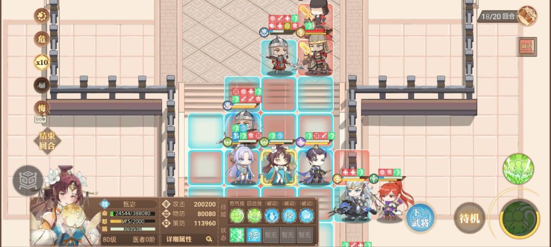 5.割须弃袍 简介:12个出阵位,本图我认为是整个马超演义中第二难的,难点在于曹操的伤害锁定以及贾诩的免伤,该说不说曹操跑的是真快。推荐12个人总战力108336250,相当于每个出阵武将达到9028021战力轻松过关。 技巧:简称追曹操。下面1上面11的站位,下面建议用骑吕或者马超,跑的快,尽可能的骚扰曹操。上面的人员走上面的缺口推进。当走出谷口后上方队伍后面将会刷新伏兵,贾诩身上有免疫伤害的B