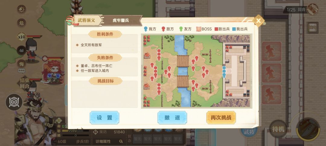 虎牢关守城战,第一会回合结束前董卓会来支援。三三站位卡城门,配合弓兵塔和法师塔毫无压力。清完前两波小股部队后可以主动出击,注意别放敌军过去就行,己方武将别脱离大部队没什么大问题,这样可以更少回合过关。求稳的可以卡城门以逸待劳,多杀几波敌军再出击,这样就毫无压力了。固守不出感觉不一定能清完敌人,没试过,有兴趣的可以试试,但实属没必要浪费这时间。#英杰传董卓武将演义攻略