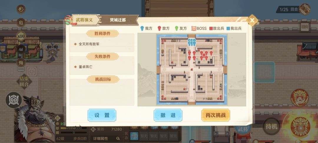 城内一共分为四个区域(右上,右下,左下,左上)分别对应一波敌人。起初右上,每清完一波安顺时针方向一次增援。由于地形比较狭窄敌人再多都不是问题。报团慢慢推就行,骑兵可以留守清理最后一个敌兵,其余人提前布防,可以利用吕布怒气技,站个好位置可以打出很高伤害其余人补刀。总体没难度回合数也很充裕。#英杰传董卓武将演义攻略