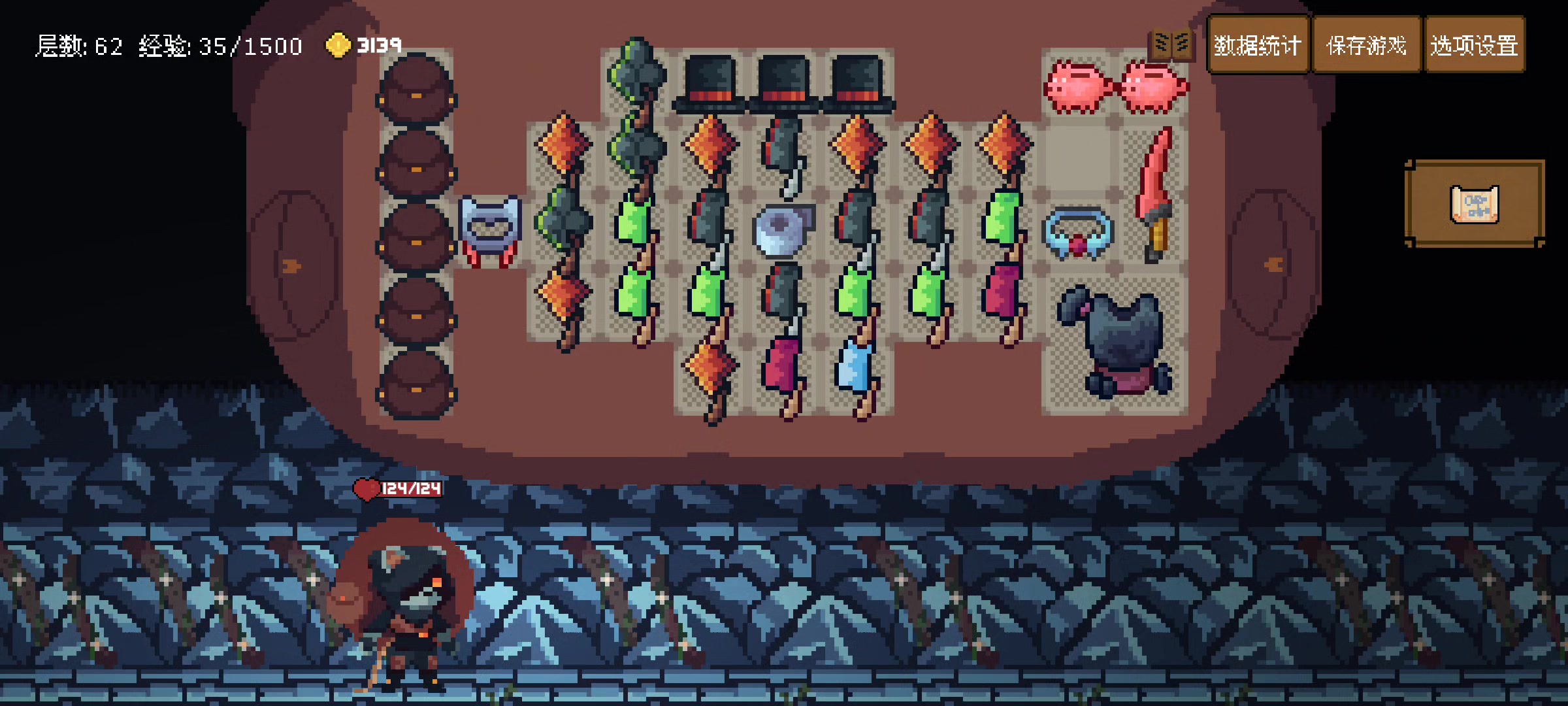 衣服最好换+3血然后失效的那个,虽然下一回合回复精力也会失效,但不失误,怪就没有下一轮行动。就是真的很费神,没有先存档的话,一不小心死了,会给你回档,建议开刷时多存档。主要难点就是坚持到有一定的启动资金、需要的组件和一个40块敲一精力的铁匠,这个闪避套路最好不要拿去推图,火蜥蜴会架烧烤架,老老实实用无敌遗物坚持到这套成型吧。P.S.几把十几层的狂怒菜刀互相触发彼此,2精力猛叠几百层狂怒,菜刀流真的