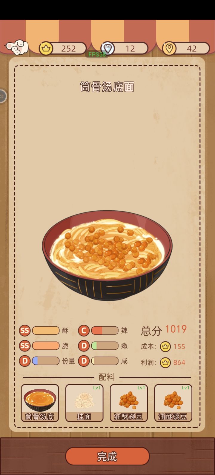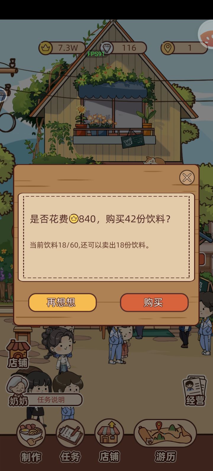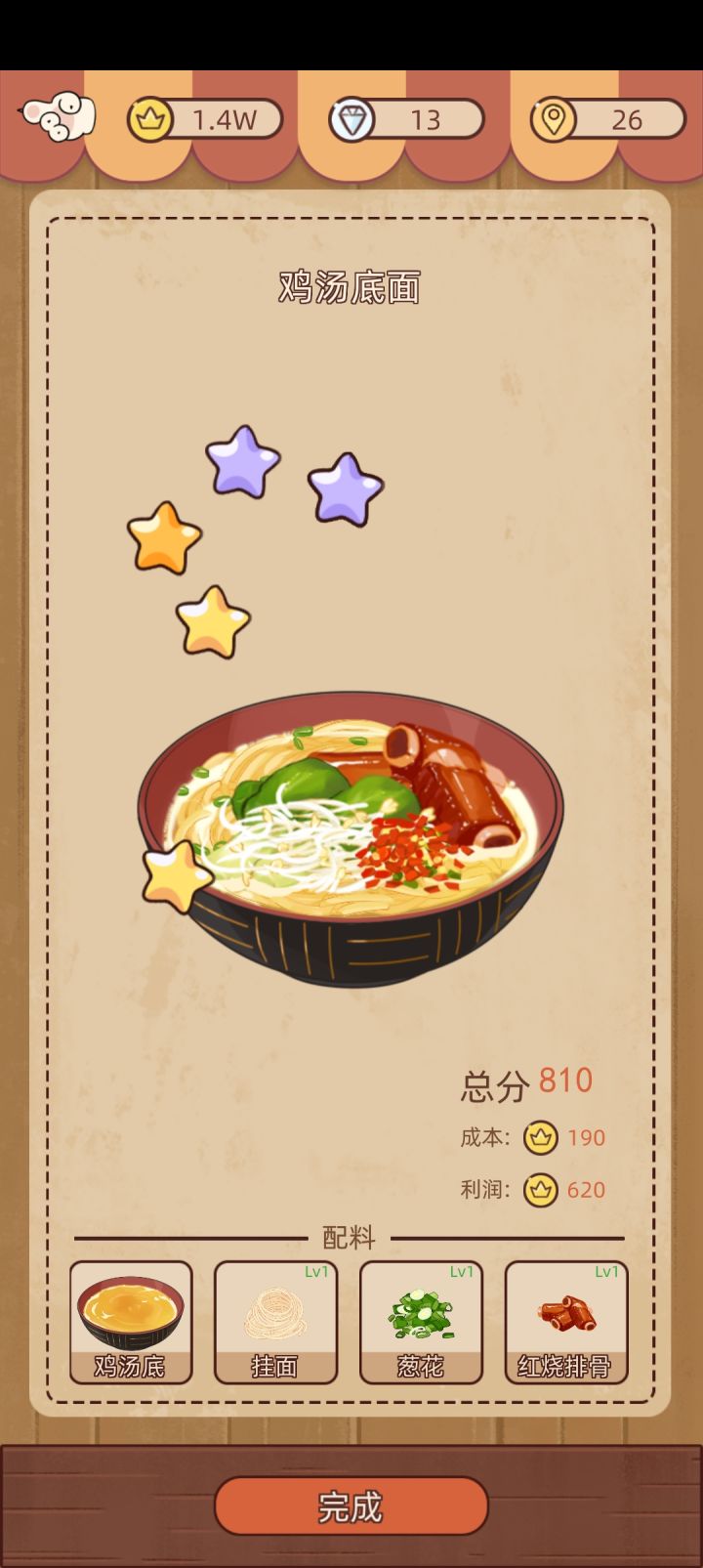 5:可玩性:除了制作面,买面,揽客之外,另一个就是出门游历里面嵌了一个类似消消乐的小游戏,目前需要操作性的玩法大概就这几个。顾客和设备和装饰还都较少,所以一下就玩到头了,作为佛系放置类游戏,这个游戏进程有点短。建议后期可以增加一些类似:奶奶的菜园可以种菜做原料。二楼做茶馆之类的。不同故事的顾客(和店主有些隐藏任务或奖励),加个特别富有的特殊顾客(可以是外卖单或者什么大单,一次定好几碗那种)(设置经验或其他,每当攒够该小进度条/次数,会触发该顾客)之类的小玩法