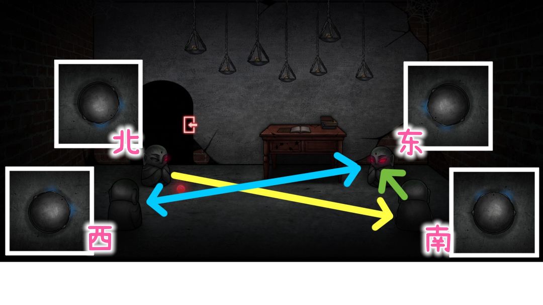 我的理解也可能有误,如有错误欢迎指正。 密室桌子右侧抽屉里,有一张纸条,说明了七盏灯按照【昂宿】摆放,四座雕像按照 【北↣南↣东⇔西】摆放,就可以反噬阵法的主人,即破坏他们的阵法。 首先是七盏灯的摆放,大厅碎玻璃那里,有一张纸条,有星宿图案,根据图片调整密室七盏灯的位置,先确定大概位置,然后微调,如果光圈变得更大更亮,说明灯放对了位置。 接着是石像,首先要确定这个房间的方位,大厅那个门,左上角的房