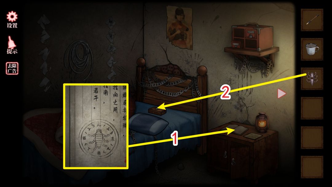 攻略作者:迷失攻略组-Neath 未经许可,禁止转载,侵权必究! 💡更多图文+视频攻略可搜公众号🔎迷失攻略组 (也是第一时间放攻略的地方(^U^)ノ 点击跳转: | | | | 第一章攻略 1、调查门锁,拿开【符纸】开锁进门。1 1.1 2、使用【梅花簪】打开柜门锁,捡起柜子上层的【剪刀】。2 2.1 3、捡起女人右边的【毛笔】,桌子上的【空杯子】,最后点击柜子顶的竹筒。3 4、摇晃竹筒
