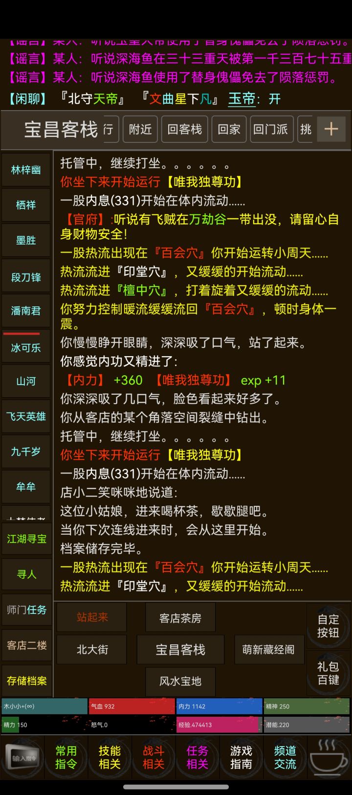 一直有个江湖梦,尤其爱金庸大佬笔下的众多侠客,小时候在电脑房玩过侠客行,没想到这么多年还能玩到更多内容的MUD游戏, 实在意外。 服务器里活人不少 群里大佬很多 怀旧神器!