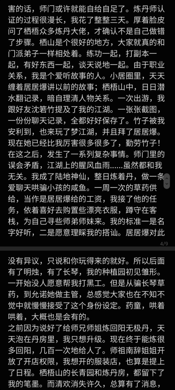 考试月被刷题搞得炸裂的某人打开了taptap,就遇到了梦江湖这款mud游戏。本来是对文字游戏不太感冒的,但是看到评分如此之高,还是忍不住步入了江湖。当时还没下载游戏就进了群,原本是想先进群看攻略准备一个好开局的(常玩游戏的本能),却被群里大佬们的热情吓了一跳😋进群之初就看见一个顶着五转之王头衔的人一直问我:拜师么拜师么。其实本意是想拜个女师傅的(真不是sp🤪),但是最终还是被打动了,自此就有了最