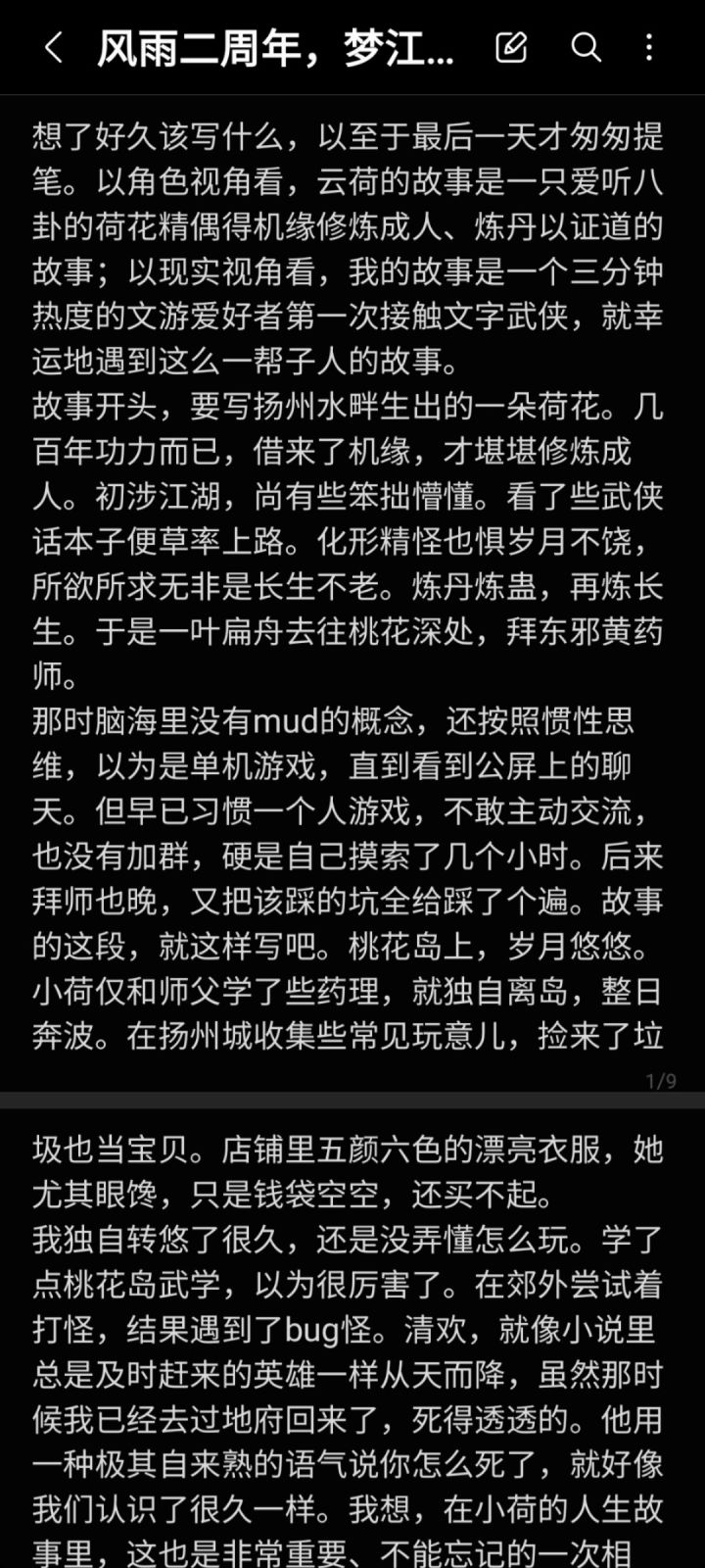 想了好久该写什么,以至于最后一天才匆匆提笔。以角色视角看,云荷的故事是一只爱听八卦的荷花精偶得机缘修炼成人、炼丹以证道的故事;以现实视角看,我的故事是一个三分钟热度的文游爱好者第一次接触文字武侠,就幸运地遇到这么一帮子人的故事。故事开头,要写扬州水畔生出的一朵荷花。几百年功力而已,借来了机缘,才堪堪修炼成人。初涉江湖,尚有些笨拙懵懂。看了些武侠话本子便草率上路。化形精怪也惧岁月不饶,所欲所求无非
