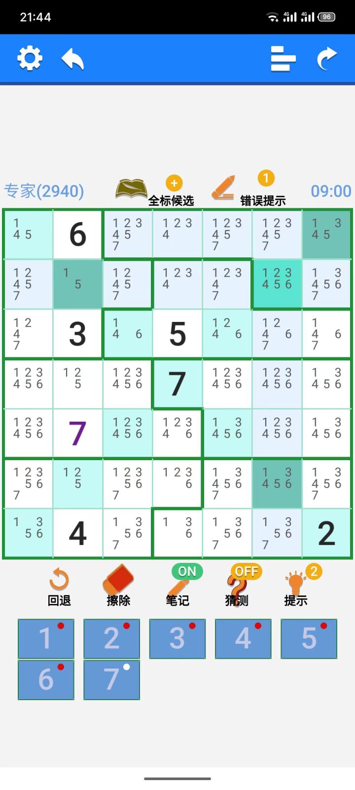 7x7的难度比5x5的高一些,比9x9的标准简单一些,最难的还是9x9的变形百分比数独。