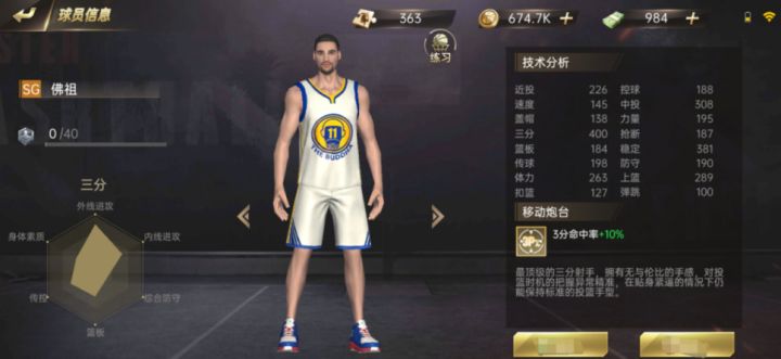 在《篮球高高手》手游中得分后首选推荐【佛祖】,一手不错的三分球和中投能力,以及控球能力不错,可以兼职控球后卫,所以小编觉得得分后卫【佛祖】是非常不错的选择而且性价比非常高接下来我们分三块来介绍得分后卫的技能搭配以及作用:技能搭配推荐搭配:拉球后撤+背后过人+变相跳步突破+快速三分球《篮球高高手》中的花式技能是随着等级的升高而不断增加的,学习的技能越多可搭配的方案就越多,那么如何利用好这些技能槽就是