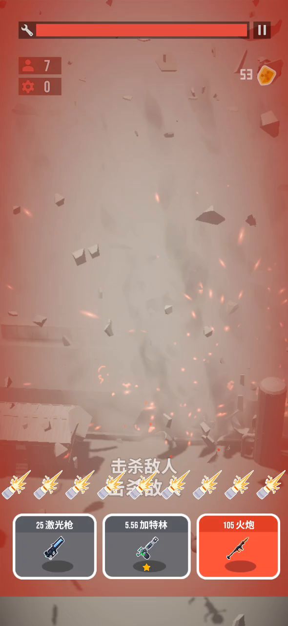 激光枪:扫地,指哪打哪,秒杀外部的人 加特林:穿墙,打建筑物内的人 高爆火炮:炸车,伤害极高