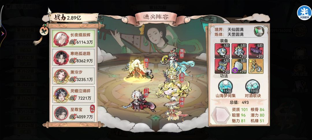 目前是顶着魔界+10%攻血防的BUFF才能打14阶蜘蛛,不过没这个buff 14阶鸟也随便打。 萌新入坑70天,号刚到手的时候阵器只有紫色322,所以出现了低阵器,高战力打仙墟的情况。目前这套阵容适用于各种仙墟和魔界(在用紫船的情况下魔君、魔将的排行都在前10,一般都是7左右) 氪佬阵容(从盟友那边学过来的,稍微改进了一下) 前排1:阿离【明光套】、【山海、松风】、【21水阵】、【2阶木】、【本命