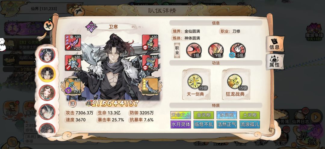 不废话。阵容魔司空,仙阿里,魔羊,唐和萧晨可仙可魔。 司空:修罗套,笔刀。装备 3 属性攻击为主,暴击,爆伤次之,第三第四词条速度和抵抗。无常胚必定要带丝。 法宝炼化暴击和爆伤再看情况补一些速度。不炼化物伤和法伤。 暴击达 100 。双龙镇 8 级以上。天赋以及怪癖➕暴击➕抵抗➕效果命中千杯不倒,大夏,剑丸子,心澄清➕命中。灵根洗好蚀骨和绝情,因为 3 灵根,点 2 灵根就开始刷技能。觉醒木灵根