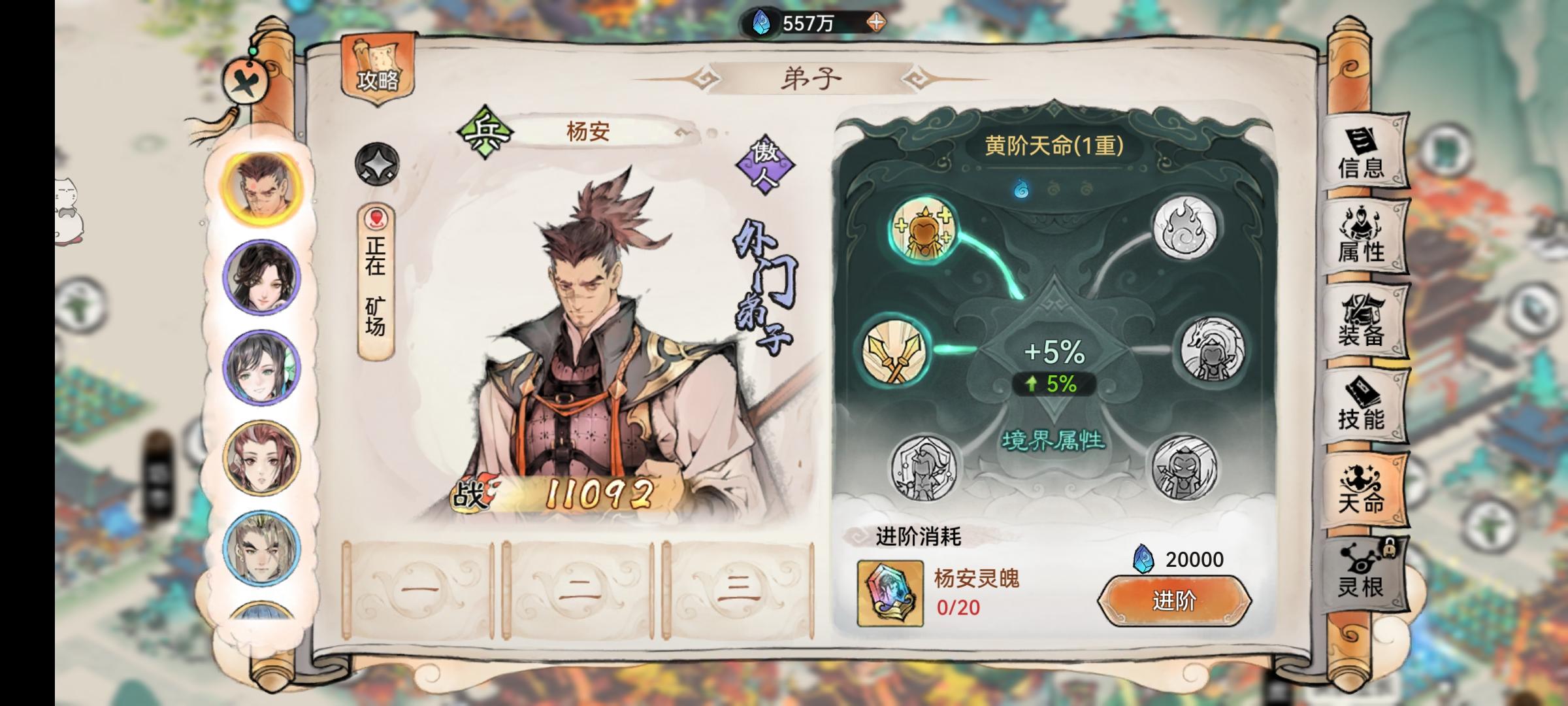 最近炼器手气很差,我就猜到了抽功法比较欧 果然100抽,两本功法就到位了 这个天火弟子也还行。 (附自己踩坑的经历,给新人养养眼) 一:给弟子吃药遵循一个原则,谁吃药给谁掌门有加层。 二:存加速道具,存挑战令,存悬赏令,不要问为啥,我也不知道,存就对了。 三:家族不好就驱逐,第二天就刷新了 四:战斗弟子,主要看潜力再看根骨,其他属性无所谓 五:传送阵右下角点进去把阵法都修复了,积少成多 六:作为新