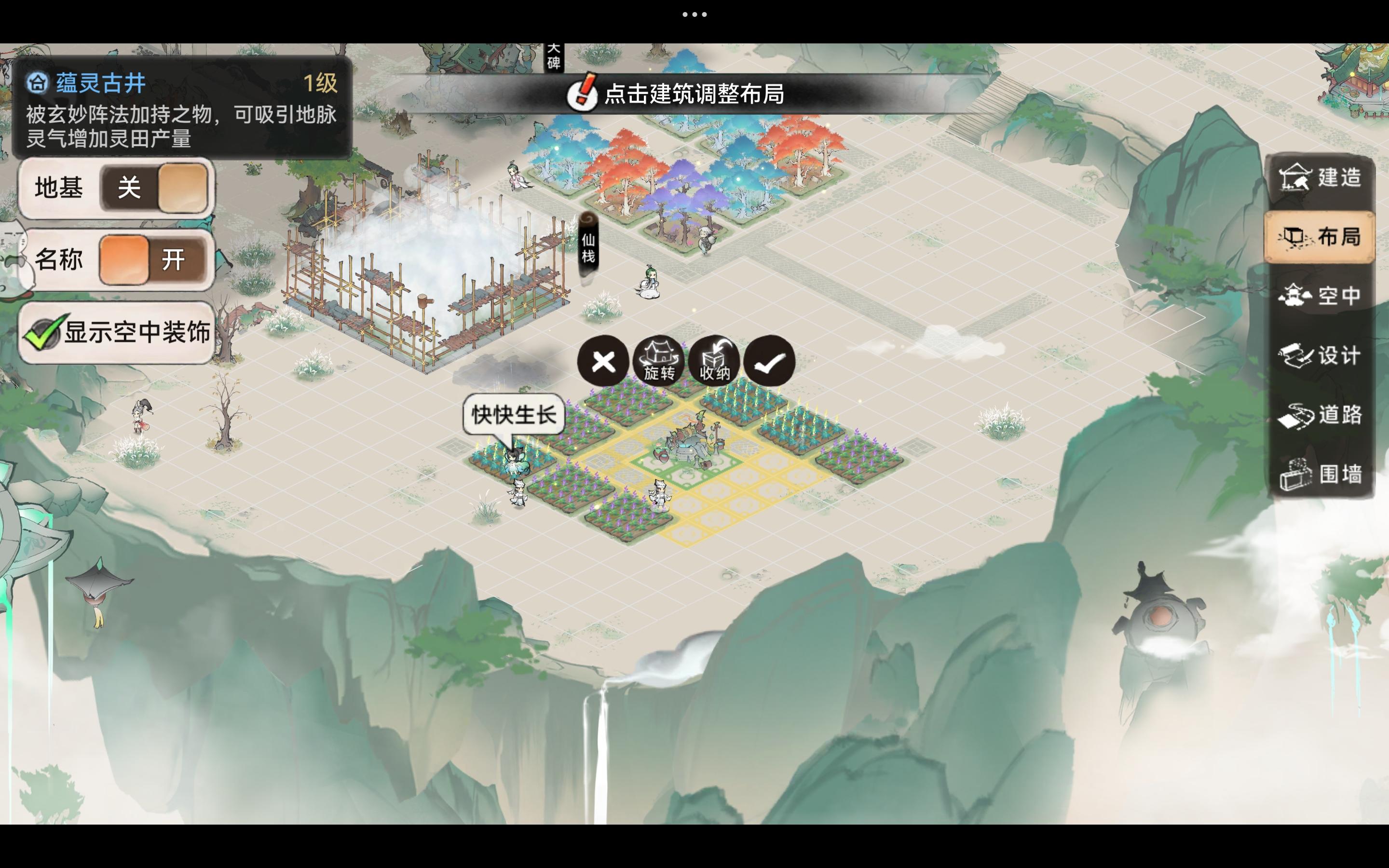 难点,居住区的房子每两排一组,每两组中间三个空地免得房子不能用。商业街,赚灵石的都在那一块。进入仙门的道路要装饰一下,两侧功能建筑摆放整齐,占地要在同一排。最难的是挑树。每种树造出来是两个外观,要统一摆放,就要挑开。高的榕树用来放在道路两边,矮的配合茂密的桃花做成花丛相得益彰。竹林也很好看,都用密竹,是有图案的