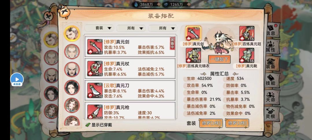 前提:由于自身认知偏差加上某两位名气最大的主播引导,大家似乎都认为剑(9%攻击)收益大于刀(12%物伤),不禁对此产生质疑,由此无聊对其进行了一系列的计算测试. 计算大前提:物伤计算与攻击的计算均为独立乘区 且其他条件 指爆伤 伤害加成等不变(控制变量) 攻击数值的来源:装备面板(如图)➕古宝攻击(总览)➕天道树 (应该再无其他来源) 物伤数值来源:弟子面板显示即可 主要公式: 伤害值=攻击✖️(